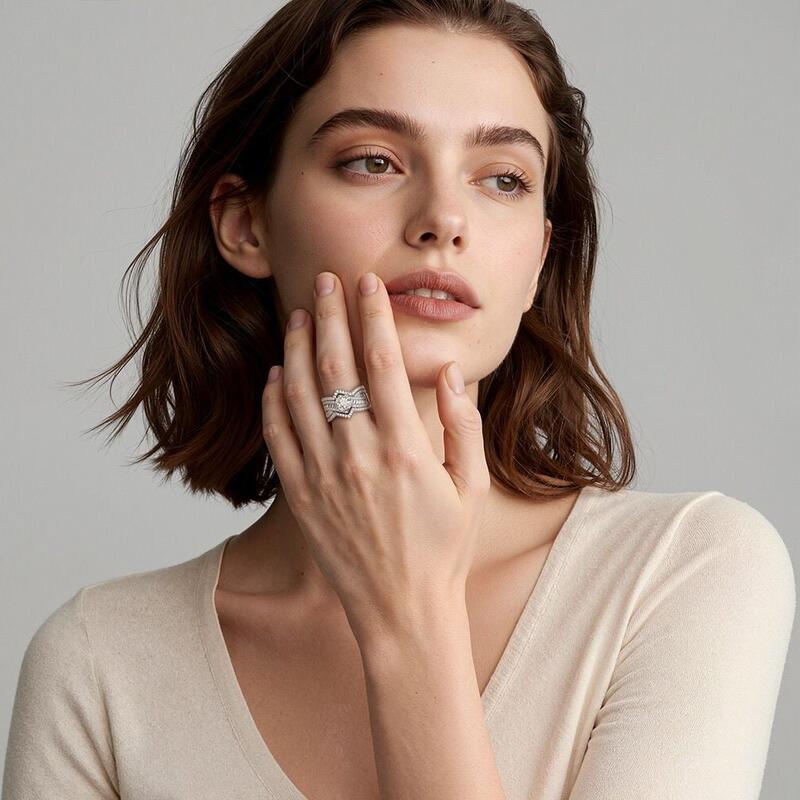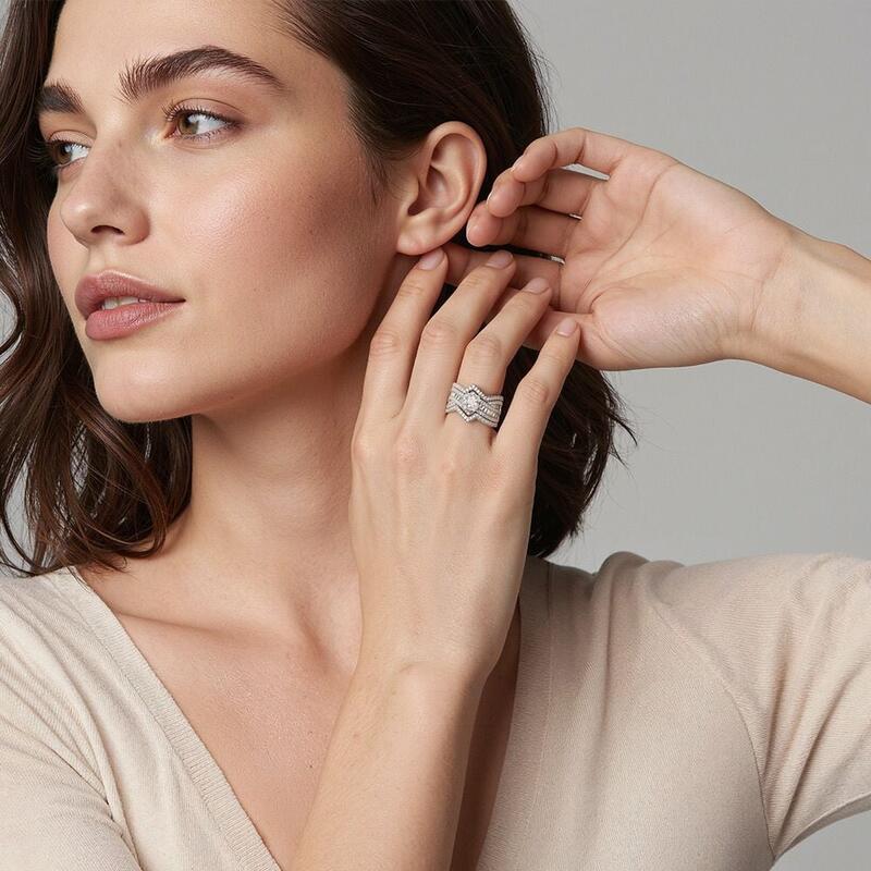 This striking bridal set features a radiant-cut center stone surrounded by a crossover shank decorated with round and rectangle-cut accent gems that sparkle brilliantly. A coordinating ring enhancer perfectly complements the stunning engagement ring. Crafted to highlight the beauty of each precious stone, this set makes for an exquisite display of luxury that the bride will cherish for a lifetime.