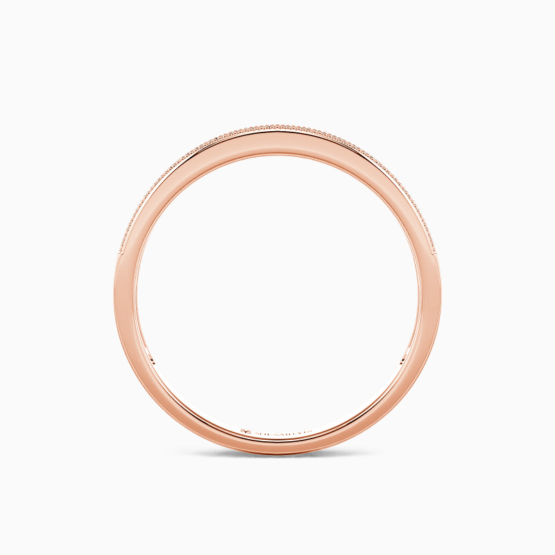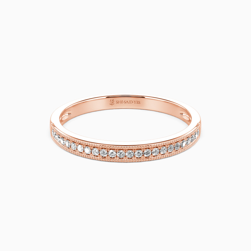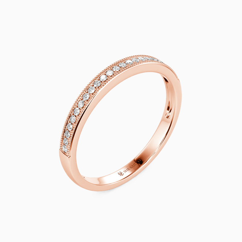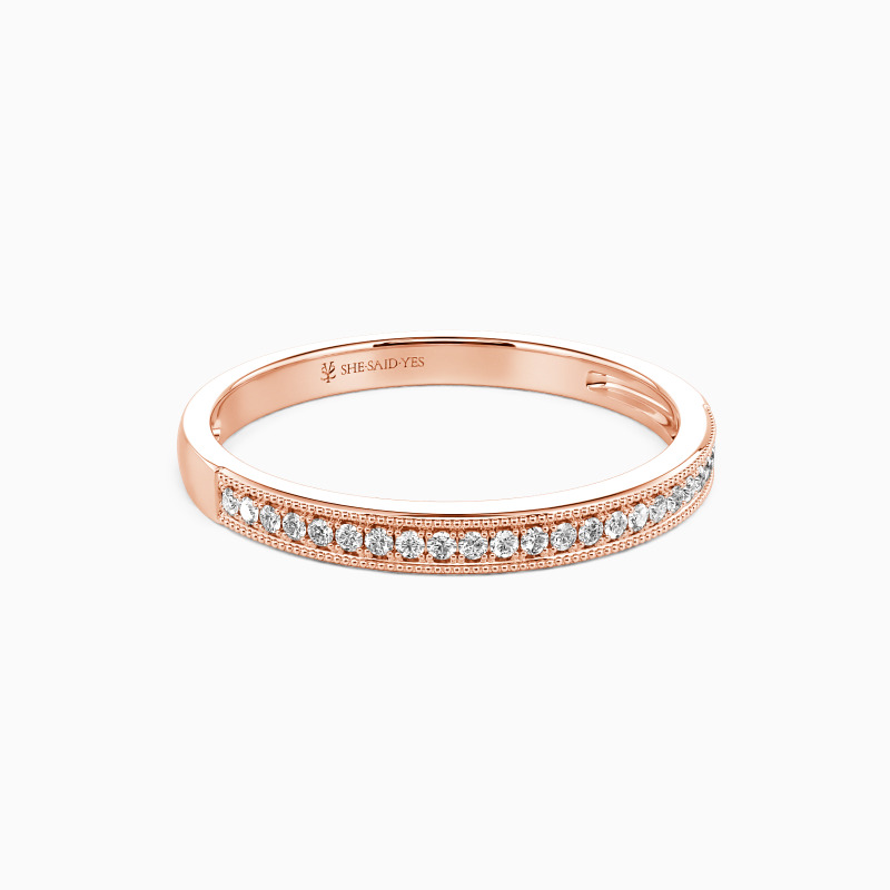 This wedding ring is designed classically with gleaming radiance. With the scintillating round-cut stones paved tidily in a channel on the polished shank, it will bring out all the brilliance of the gems and add a hint of elaboration with milgrain accents to your looks.