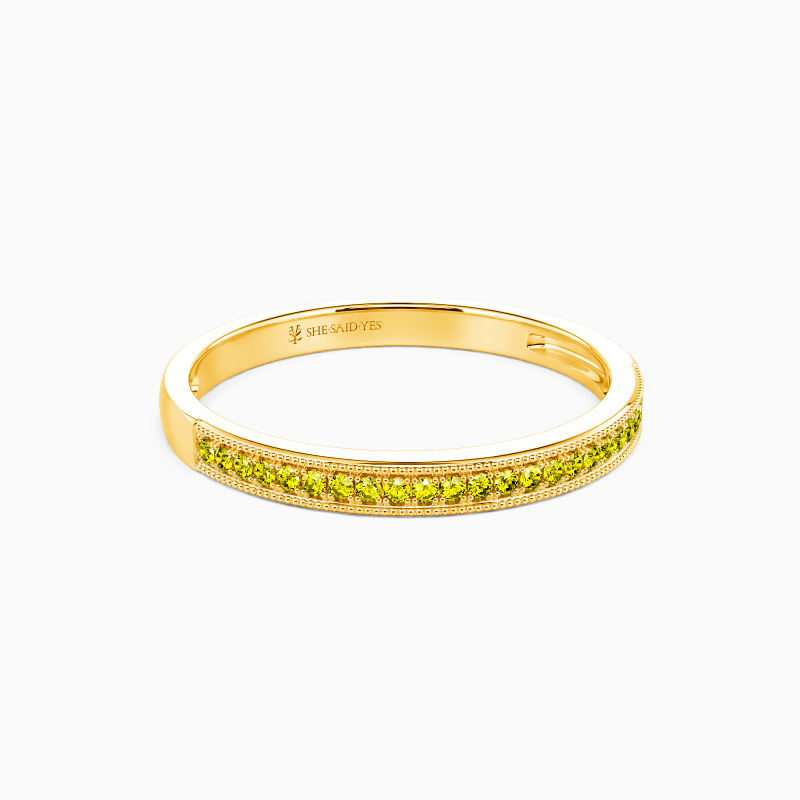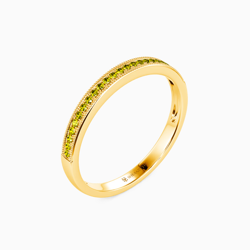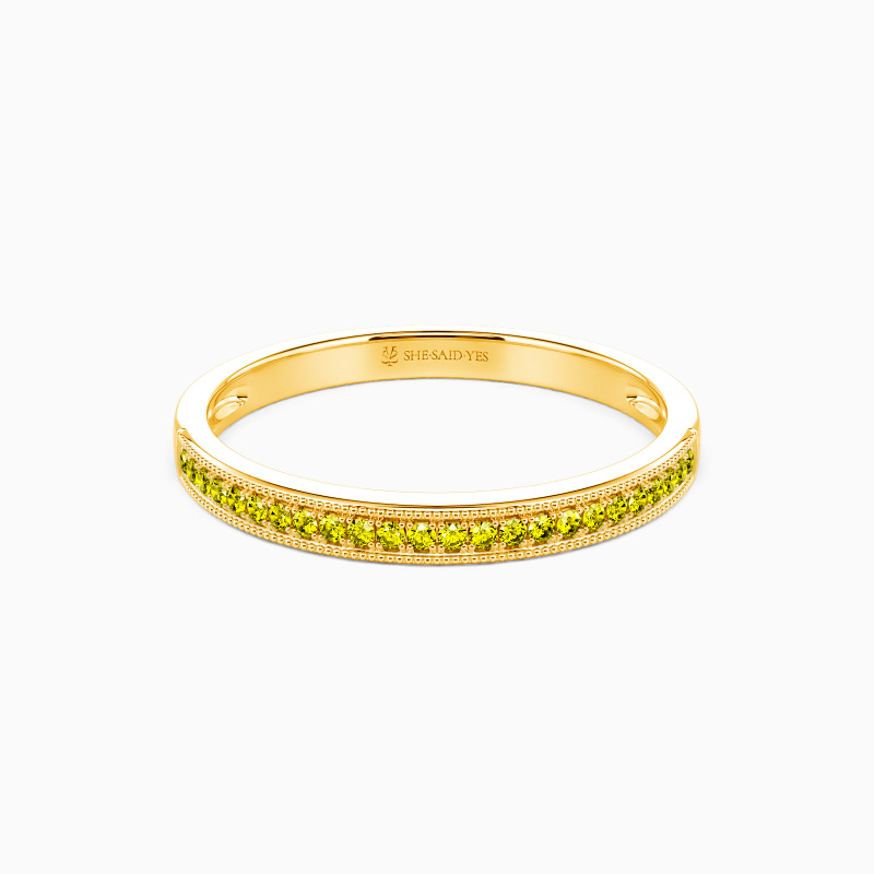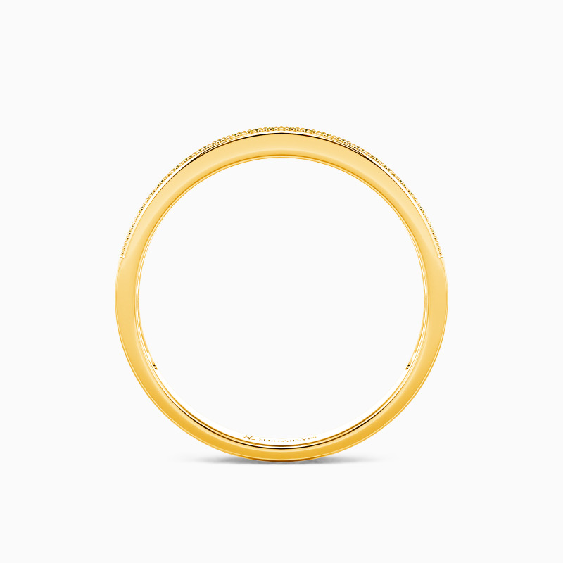 This wedding ring is designed classically with gleaming radiance. With the scintillating round-cut stones paved tidily in a channel on the polished shank, it will bring out all the brilliance of the gems and add a hint of elaboration with milgrain accents to your looks.