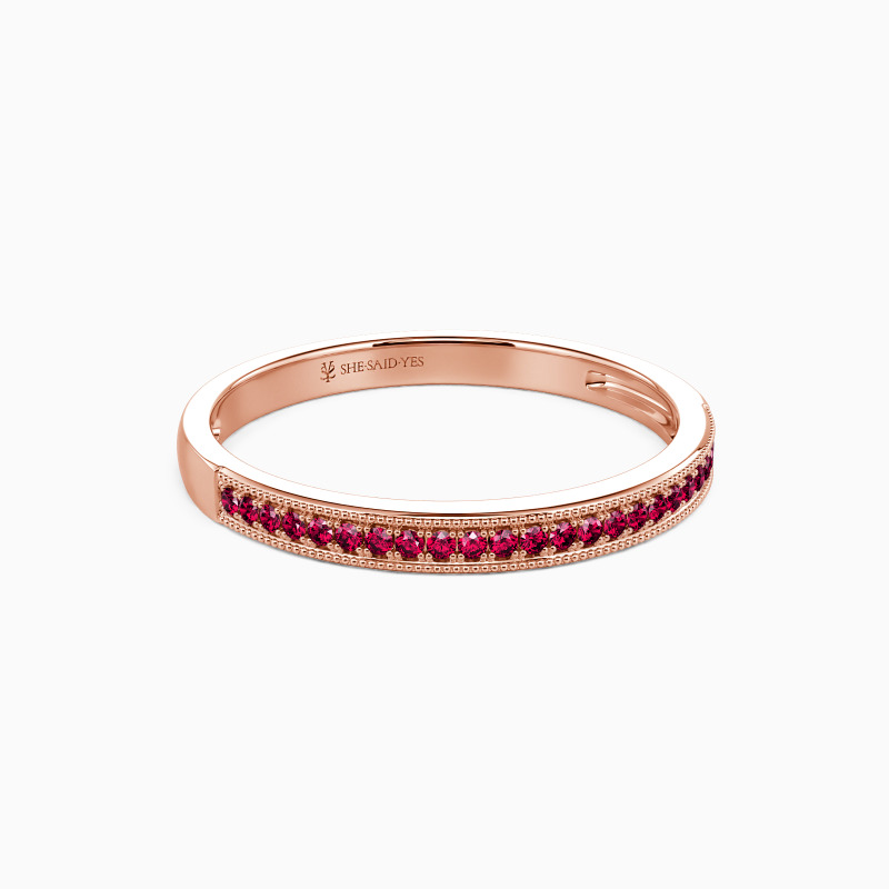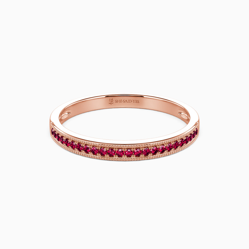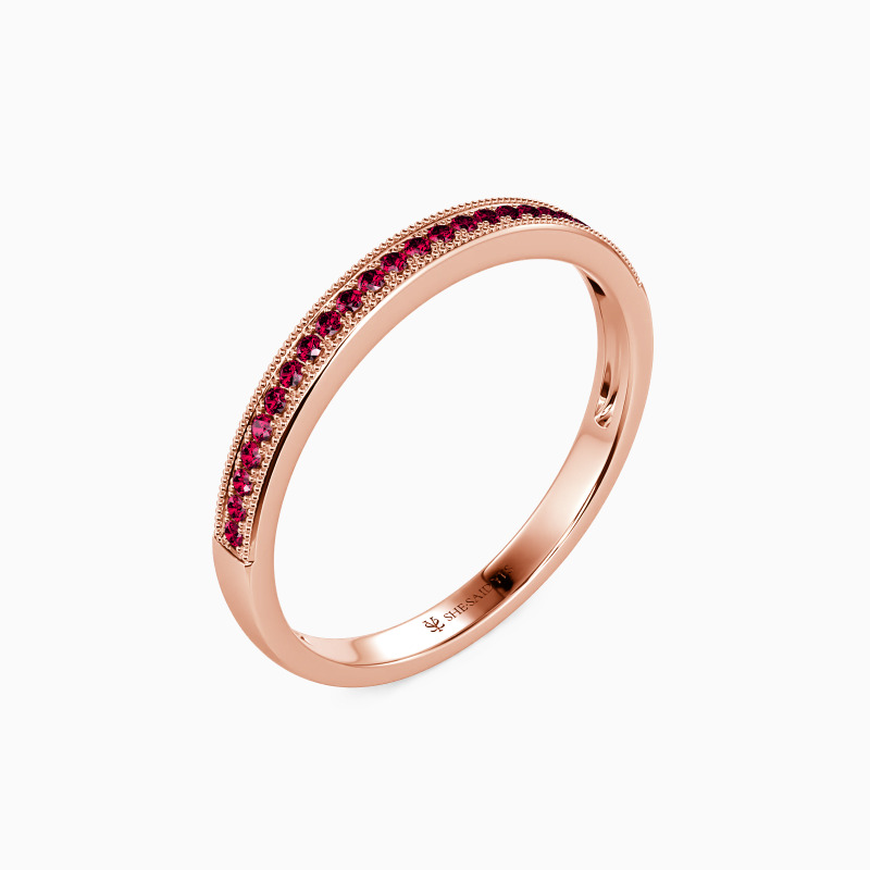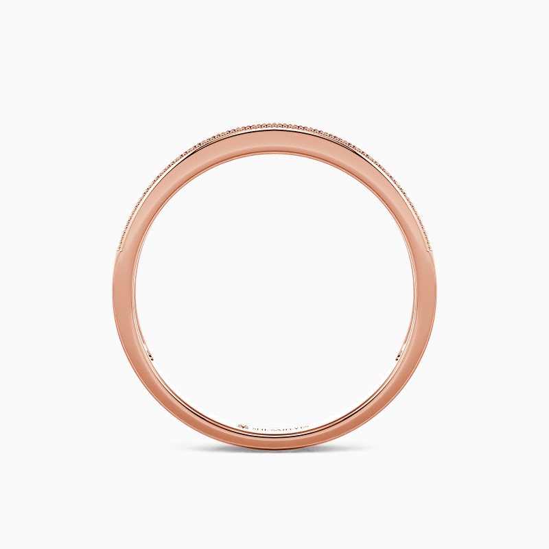This wedding ring is designed classically with gleaming radiance. With the scintillating round-cut stones paved tidily in a channel on the polished shank, it will bring out all the brilliance of the gems and add a hint of elaboration with milgrain accents to your looks.