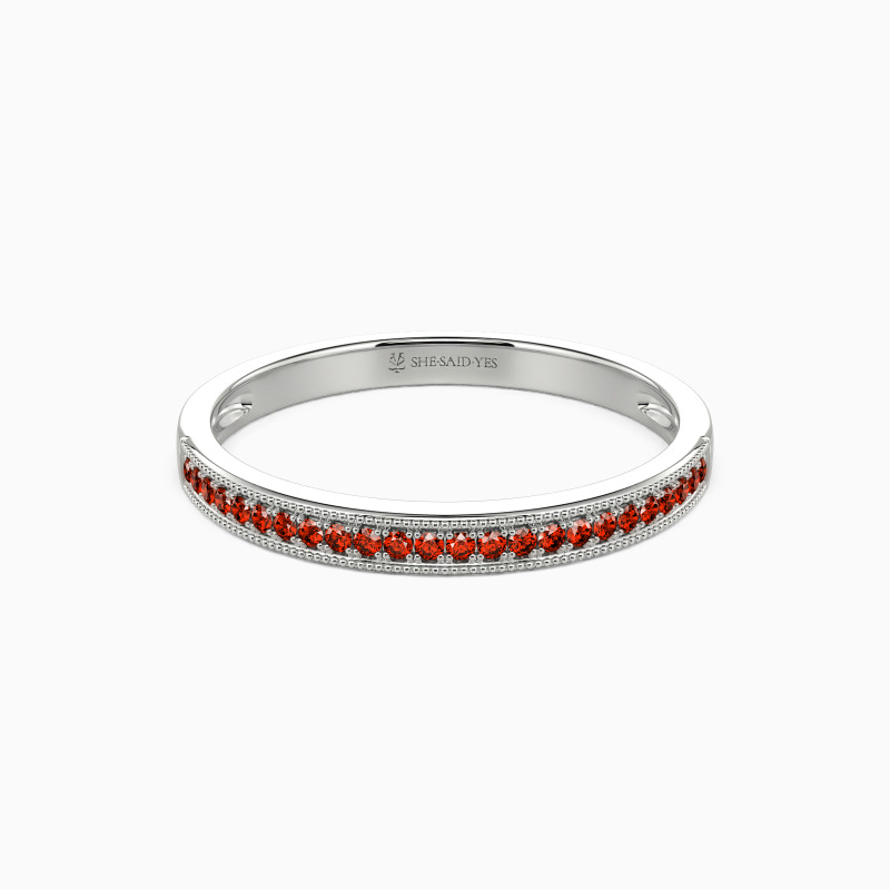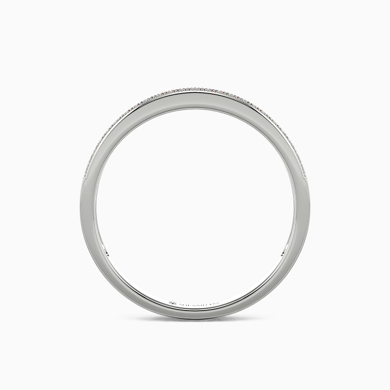 This wedding ring is designed classically with gleaming radiance. With the scintillating round-cut stones paved tidily in a channel on the polished shank, it will bring out all the brilliance of the gems and add a hint of elaboration with milgrain accents to your looks.