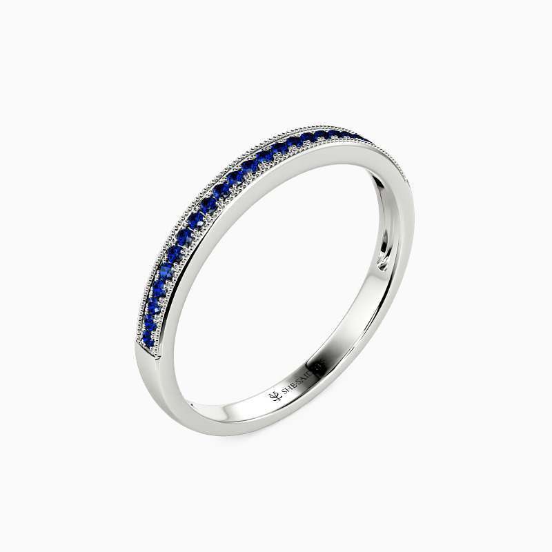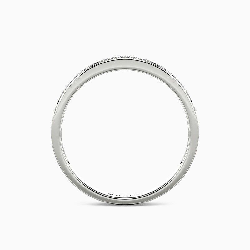 This wedding ring is designed classically with gleaming radiance. With the scintillating round-cut stones paved tidily in a channel on the polished shank, it will bring out all the brilliance of the gems and add a hint of elaboration with milgrain accents to your looks.