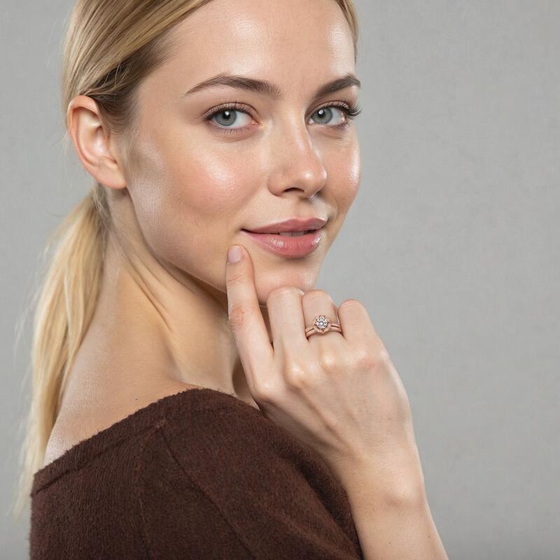 Brilliant and charming. This vintage-inspired bridal set challenges the very essence of jewelry aesthetics. The striking center stone cuts in a round shape, embracing the exquisite halo frame of a lotus paved with shimmering stones. Pairing with a shining channel-paved wedding band, this bridal set lends a charming glamour to every woman.