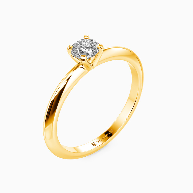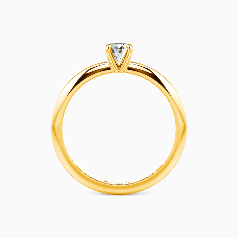 This solitaire ring combines simplicity with sophistication. A round-cut gem sits securely in a four-prong setting, while the knife edge shank offers a sleek, modern profile. The crisp lines of the band draw attention to the center stone, creating a harmonious balance. This refined design speaks to those who appreciate clean aesthetics and timeless elegance in their jewelry choices.