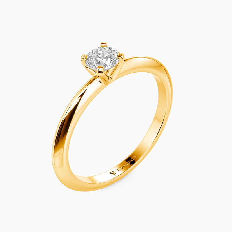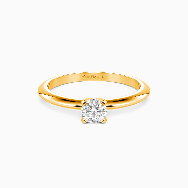 This solitaire ring combines simplicity with sophistication. A round-cut gem sits securely in a four-prong setting, while the knife edge shank offers a sleek, modern profile. The crisp lines of the band draw attention to the center stone, creating a harmonious balance. This refined design speaks to those who appreciate clean aesthetics and timeless elegance in their jewelry choices.