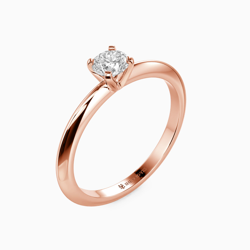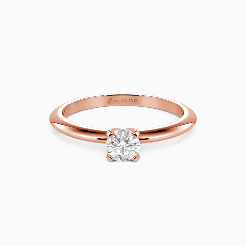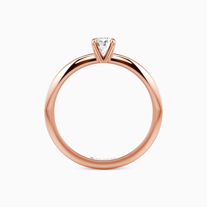 This solitaire ring combines simplicity with sophistication. A round-cut gem sits securely in a four-prong setting, while the knife edge shank offers a sleek, modern profile. The crisp lines of the band draw attention to the center stone, creating a harmonious balance. This refined design speaks to those who appreciate clean aesthetics and timeless elegance in their jewelry choices.