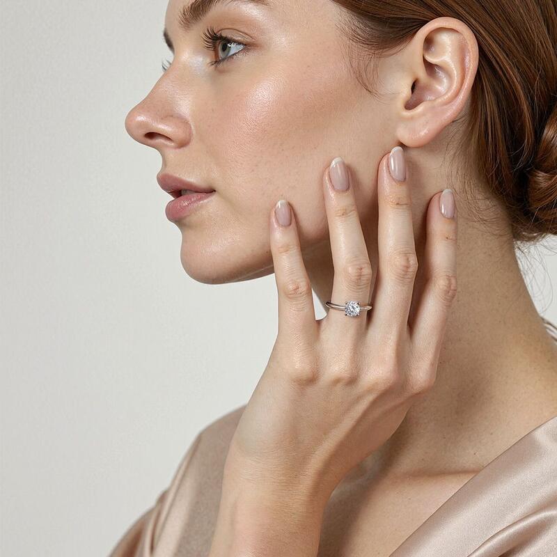 This solitaire ring combines simplicity with sophistication. A round-cut gem sits securely in a four-prong setting, while the knife edge shank offers a sleek, modern profile. The crisp lines of the band draw attention to the center stone, creating a harmonious balance. This refined design speaks to those who appreciate clean aesthetics and timeless elegance in their jewelry choices.