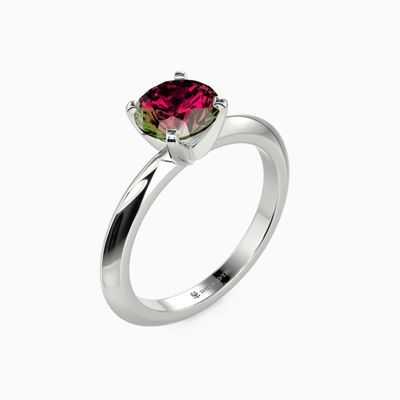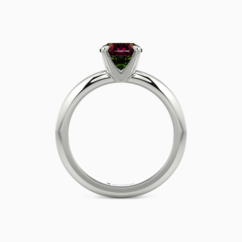 This solitaire ring combines simplicity with sophistication. A round-cut gem sits securely in a four-prong setting, while the knife edge shank offers a sleek, modern profile. The crisp lines of the band draw attention to the center stone, creating a harmonious balance. This refined design speaks to those who appreciate clean aesthetics and timeless elegance in their jewelry choices.