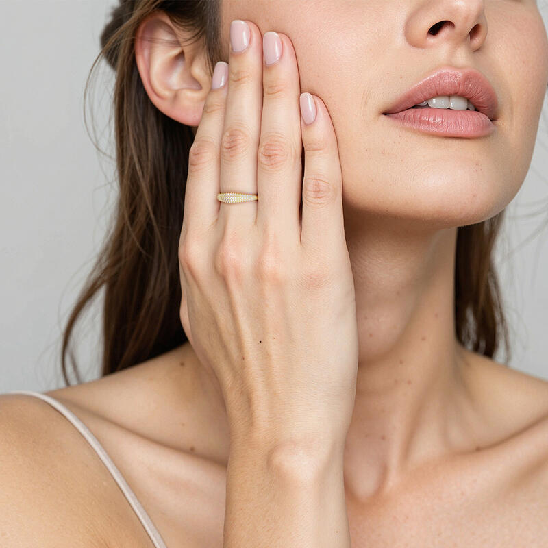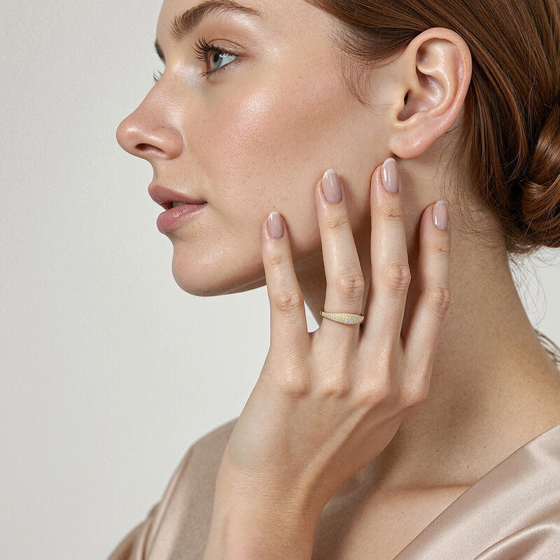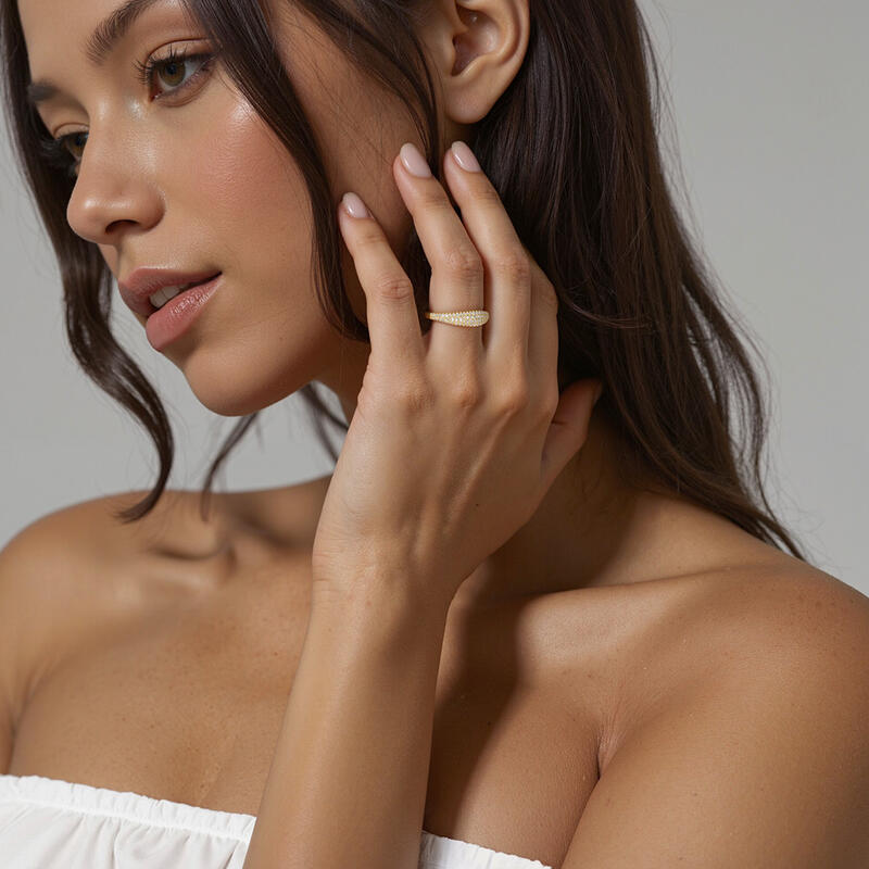 Start a brand-new day with a piece of refined jewelry from SHE·SAID·YES. It shows up modernly with a shimmering pave setting and a domed shank. Gathering all the radiance, it's ideal for your daily look.