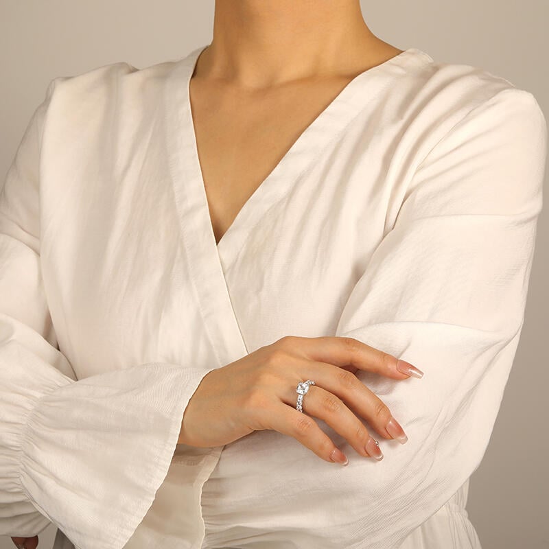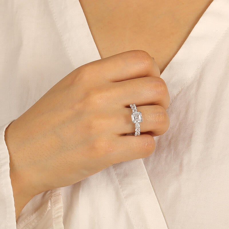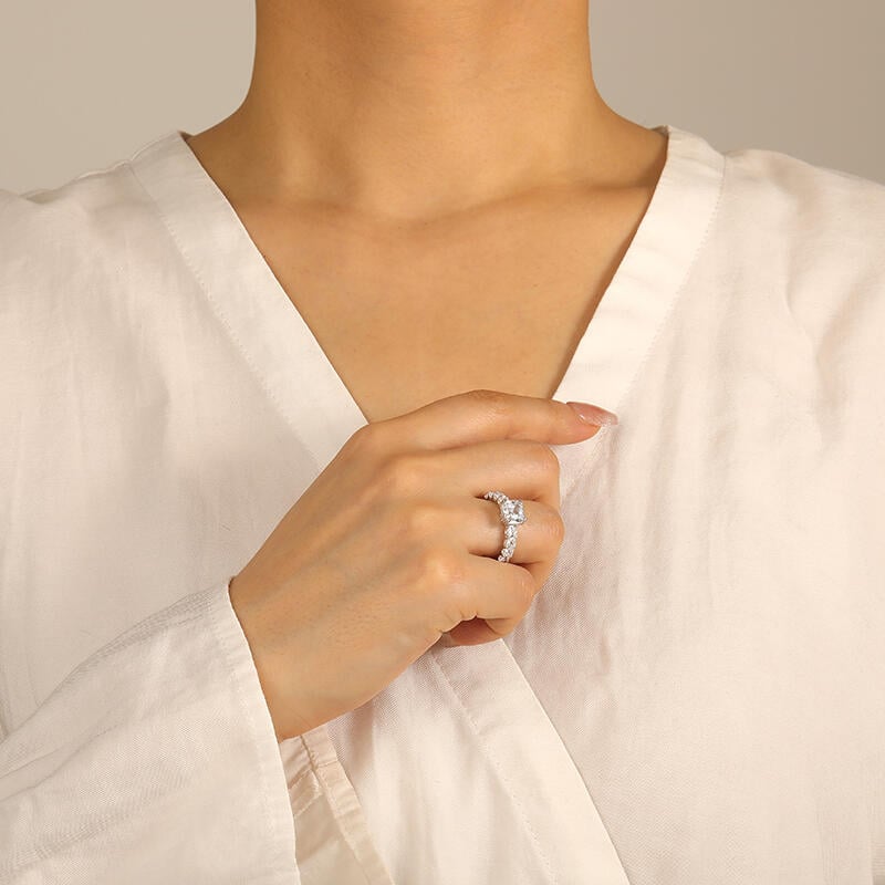 Classic and chic. SHE·SAID·YES' refined engagement ring radiates a dazzling radiant-cut center stone with unparalleled brilliance. Enhanced by a row of faceted radiant-cut gems line along the shank for an elevated beauty, this piece showcases the ultimate jewelry aesthetic for a bride-to-be.
