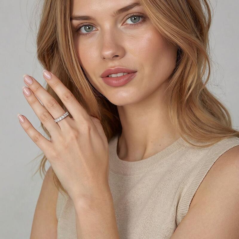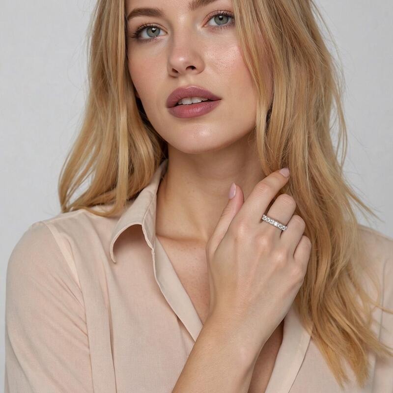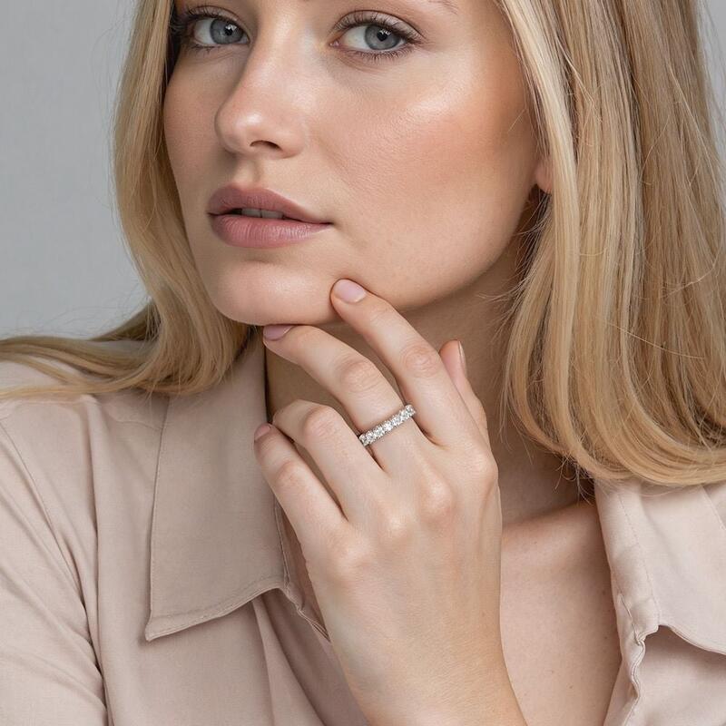 Featuring a series of shimmering radiant-cut gems, this delicate half-eternity band is full of breathtaking glamour. Effortlessly creating an elegant look suitable for everyday wear, this dainty wedding ring will catch everyone's attention easily.
