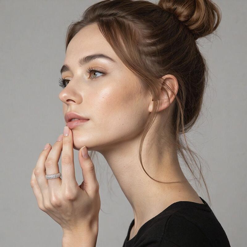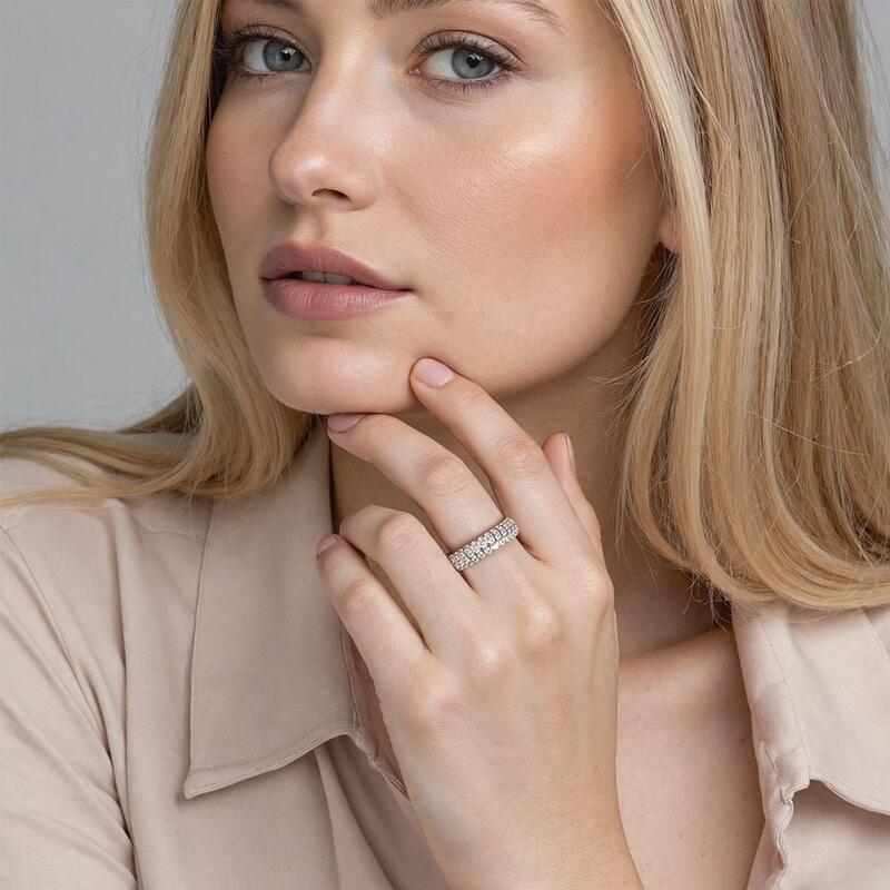 This captivating eternity ring is a testament to everlasting love. With three rows of dazzling round gemstones, this ring radiates elegance and sophistication. The tension setting enhances the brilliance of each stone, creating a mesmerizing sparkle. Crafted to endure through all moments - both joyous and challenging - this ring's beauty serves as a gentle reminder of love's enduring power. Wear it and feel cherished always.