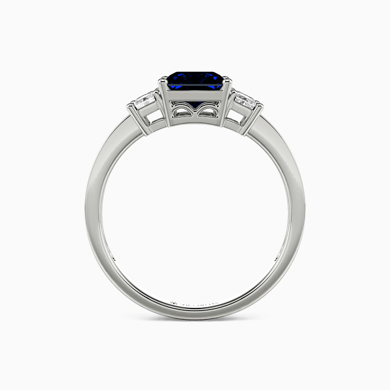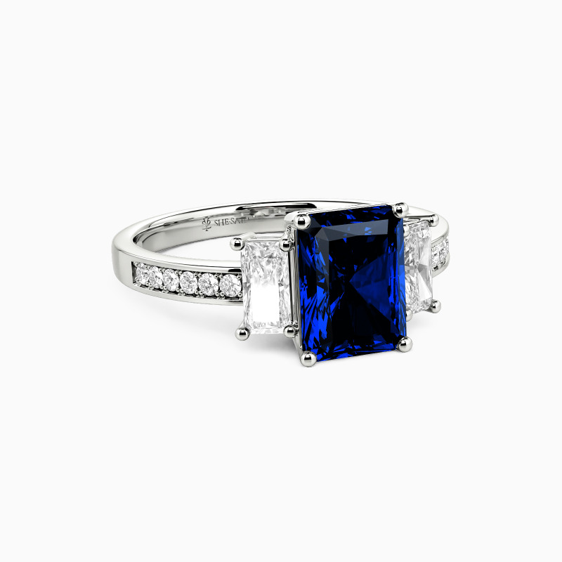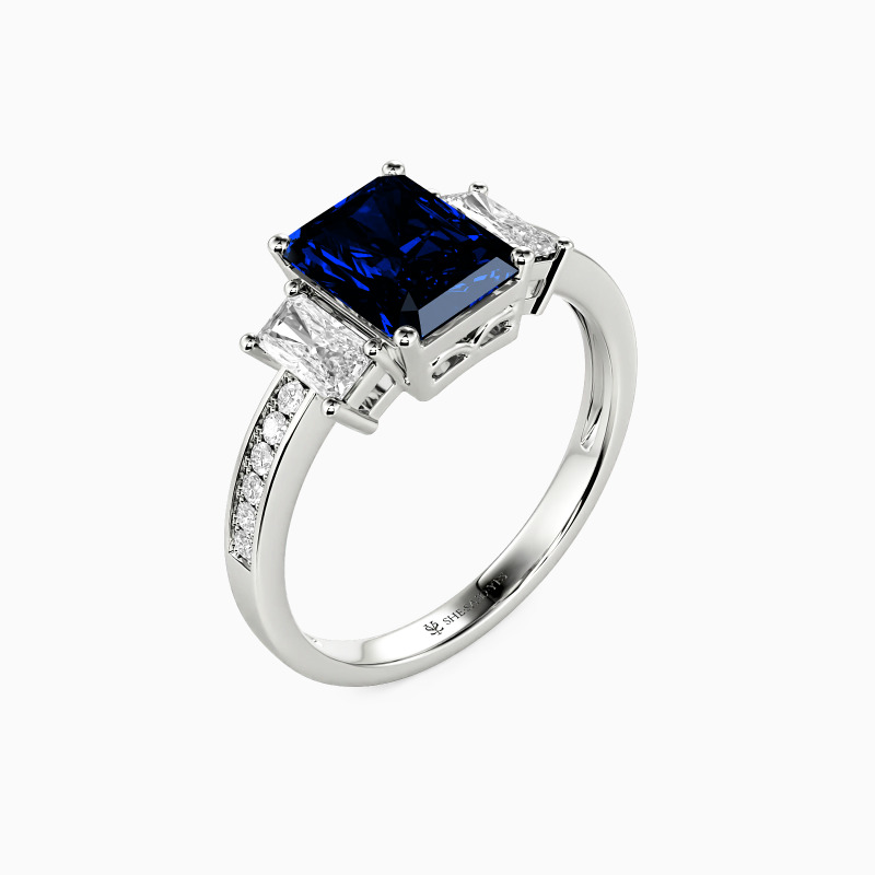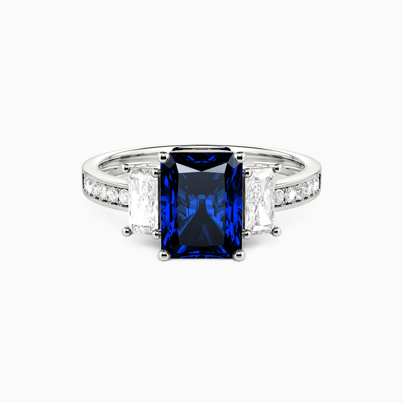 Elevate your love story with this breathtaking three-stone engagement ring. A captivating radiant-cut center stone takes center stage, accompanied by two smaller radiant-cut gems on either side. The bright-cut paved shank enhances the ring's brilliance, creating a mesmerizing display of light that reflects your enduring passion.