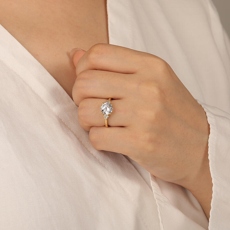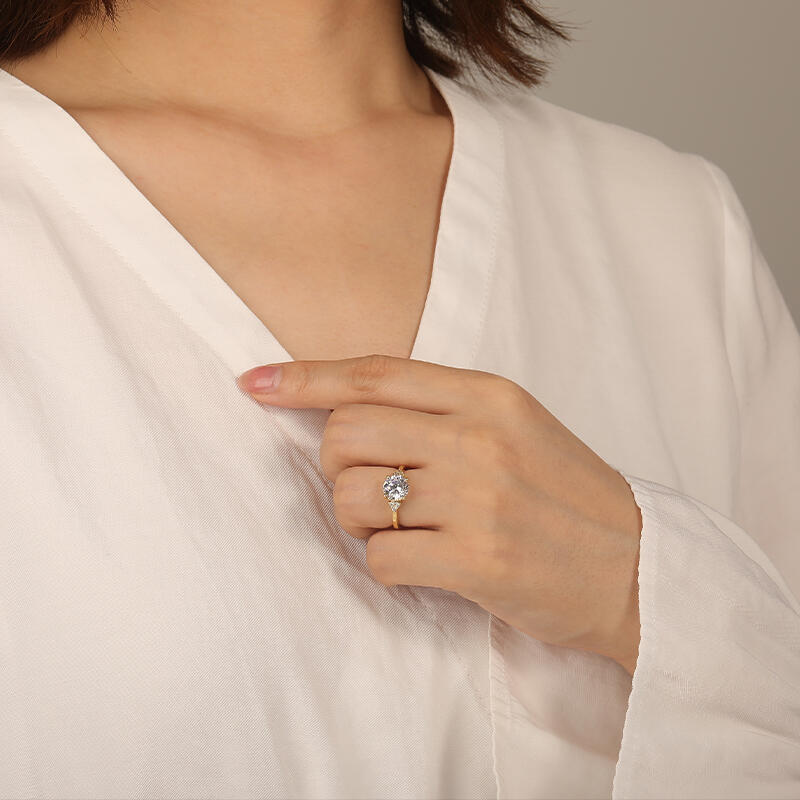 This exquisite side-stone engagement ring epitomizes timeless elegance and enduring love. It features a dazzling round-cut center stone, surrounded by a cluster of small, gleaming gems on each side. Wrapped in a delicate band of precious metal, this ring combines elegant simplicity with understated glamour. Subtle yet meaningful, it will forever remind the wearer of your deep commitment to a life together.