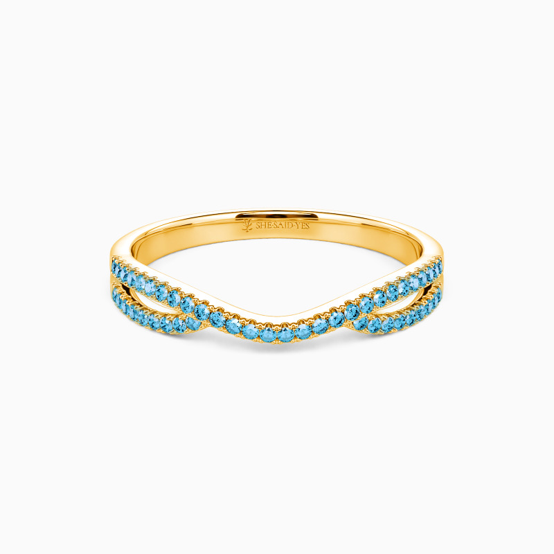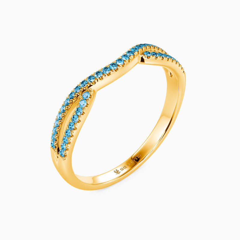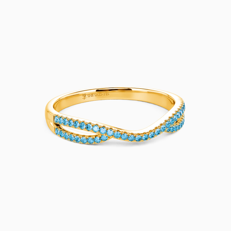 A classic wedding band reflects all her wishes about marriage. Featuring an elegantly twisted split shank with a row of shining pave set in round-cut stones, its delicate appearance allows any attire to show the women’s beauty.