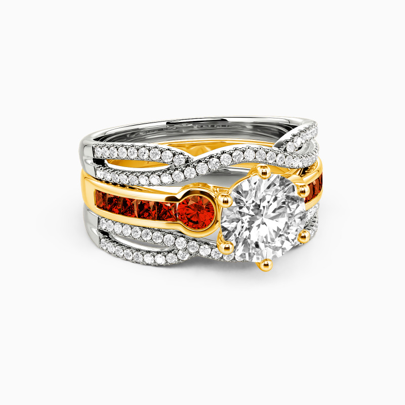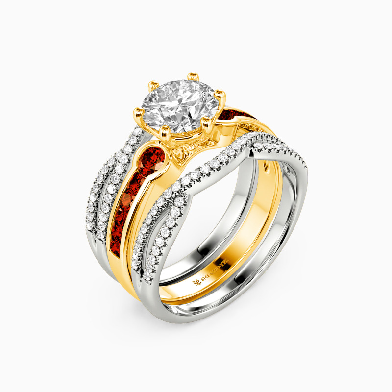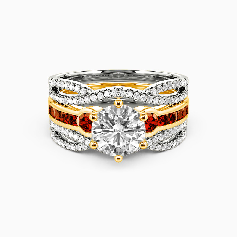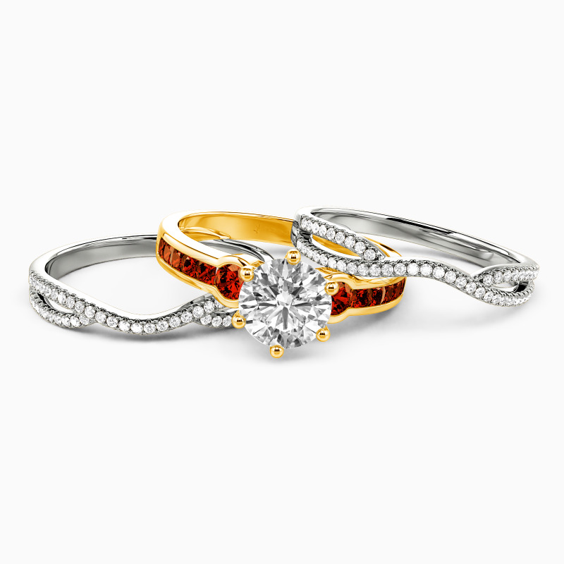 Brilliant and attractive. This charming bridal set is studded with a scintillating round-cut center stone in six prongs, and two round side stones flanked on the emerald-cut channel setting for extra gloss. Matching the twisted split wedding bands of round paving stones, it’s certain to win her heart with the classic radiance.