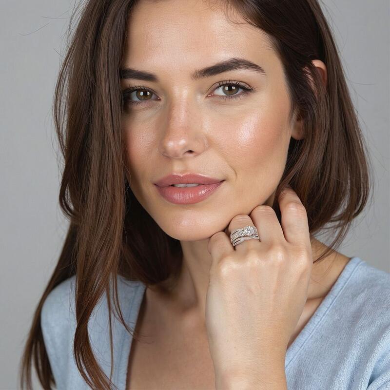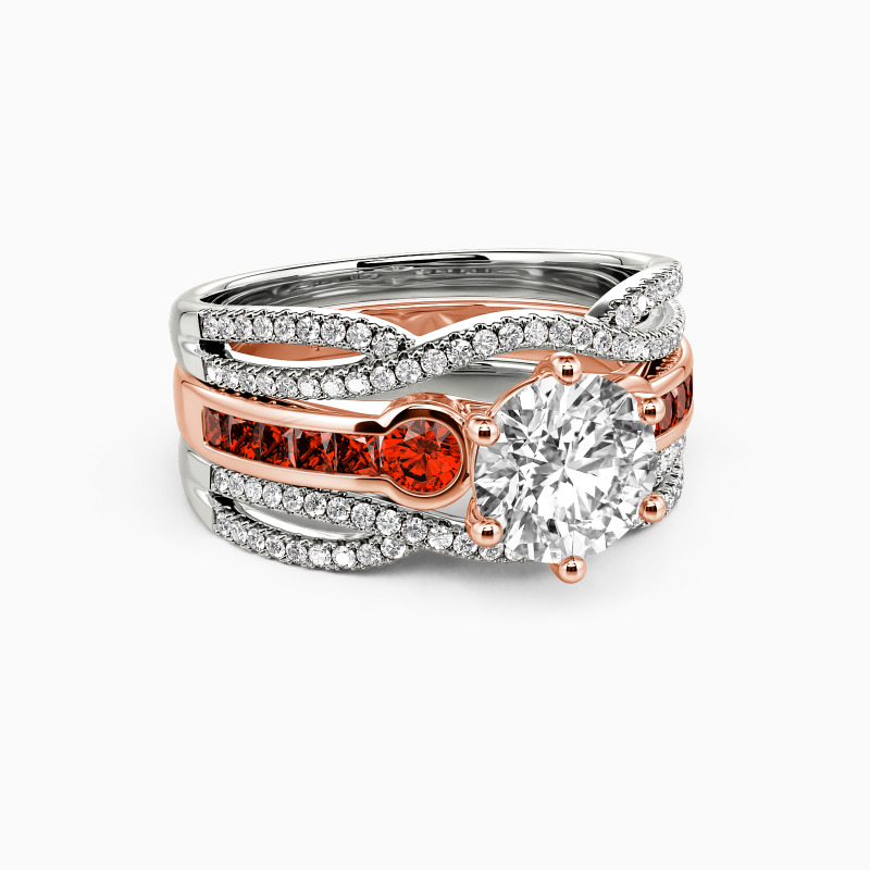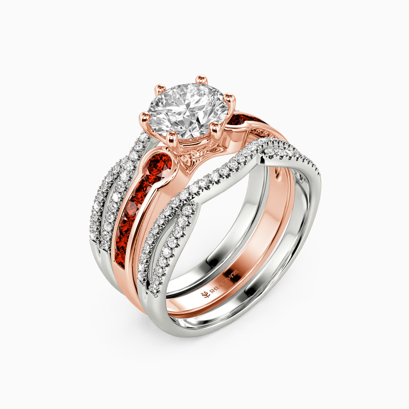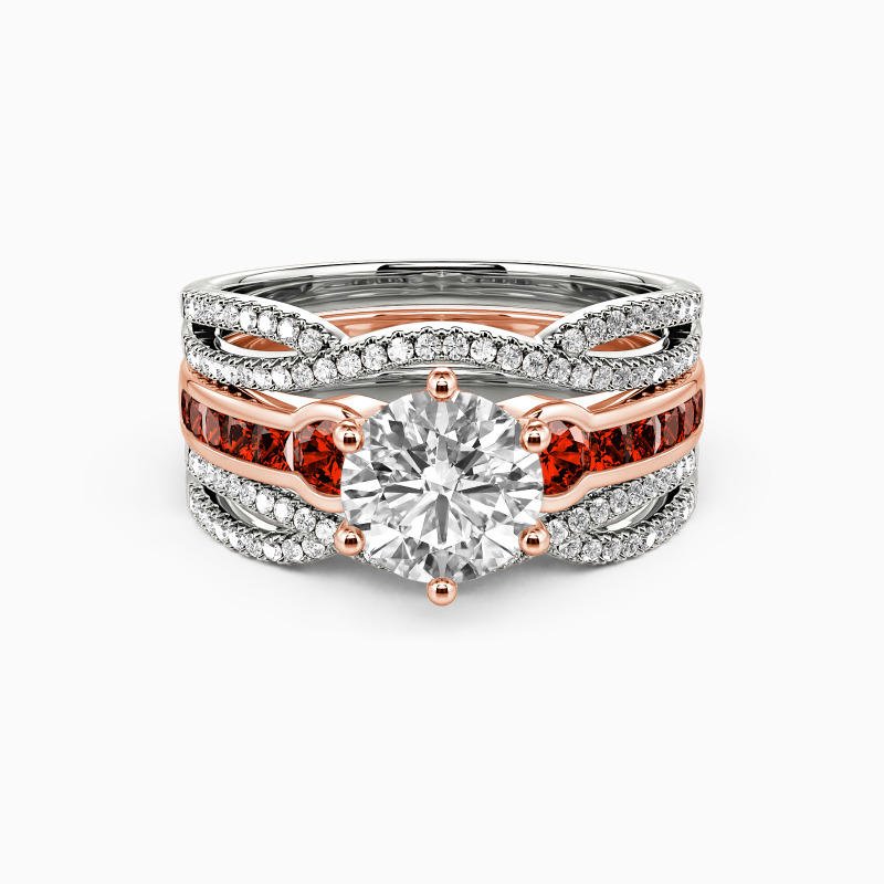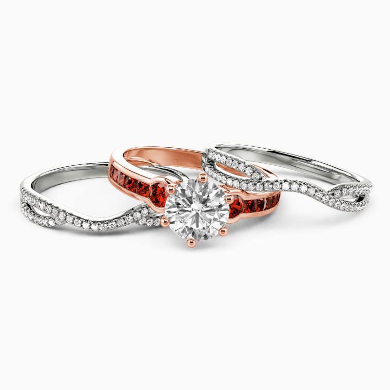 Brilliant and attractive. This charming bridal set is studded with a scintillating round-cut center stone in six prongs, and two round side stones flanked on the emerald-cut channel setting for extra gloss. Matching the twisted split wedding bands of round paving stones, it’s certain to win her heart with the classic radiance.