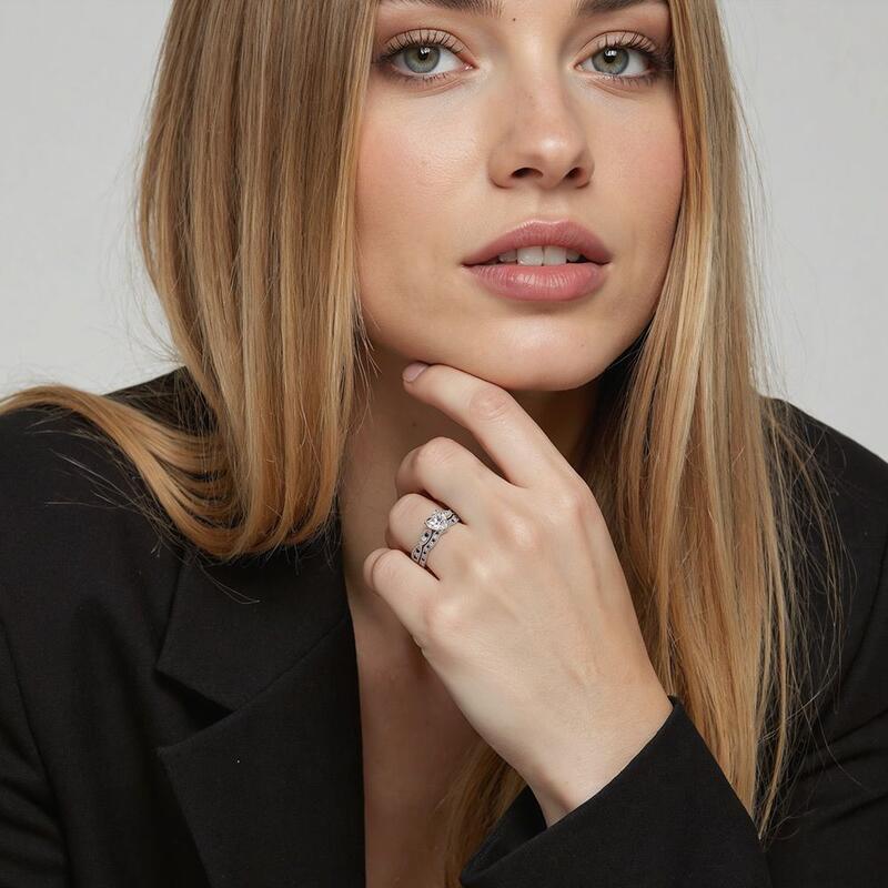 Swooning your heart, this delicate bridal set is a dream come true. With a striking heart-shaped stone in the middle, a row of exquisite Scalloped patterns accent half of the band for elevated sophistication. The wedding band is designed in a wavy shank with intricate milgrain details. It’s an infallible choice for every bride-to-be.