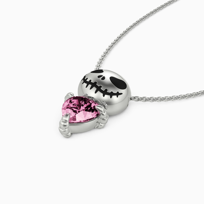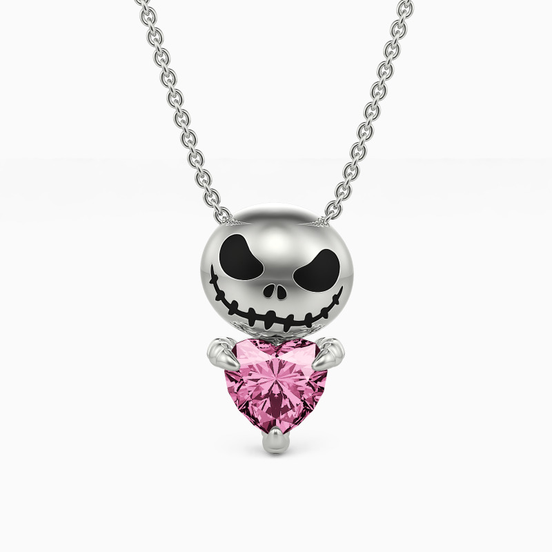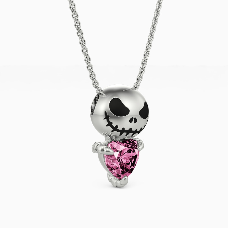 Expressing quirky style with sophisticated details, our unique pendant necklace features a delicate smiling skull and a sparkling heart-shaped gemstone set in the claws. Inspired by Nightmare Before Christmas, this trendy accessory is especially for those who love Gothic fashion.