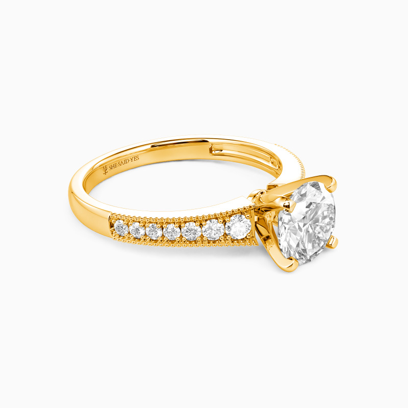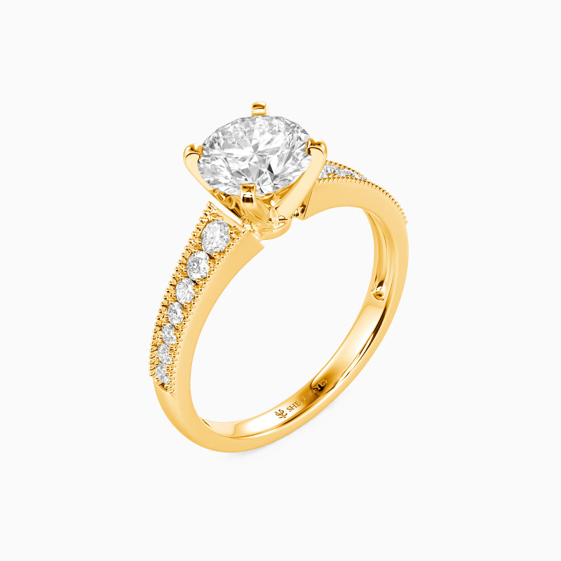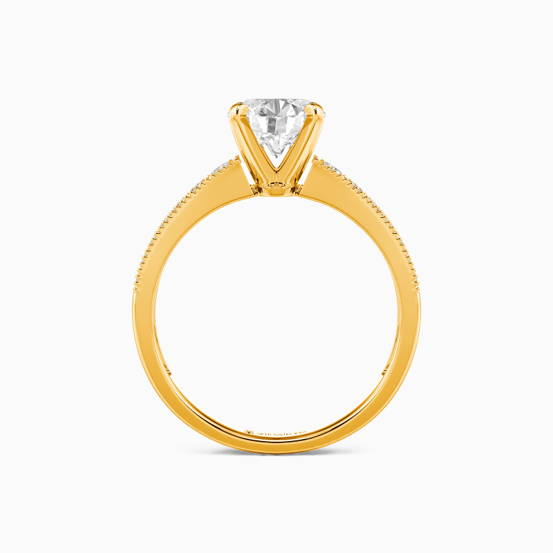 This enchanting engagement ring captivates with its timeless elegance. The round-cut center stone, securely held by a four-prong setting, takes center stage. The tapered shank features graduated round gems that create a mesmerizing cascade of brilliance. Delicate milgrain details add a touch of vintage charm, enhancing the ring's refined beauty and making it a true symbol of enduring love.