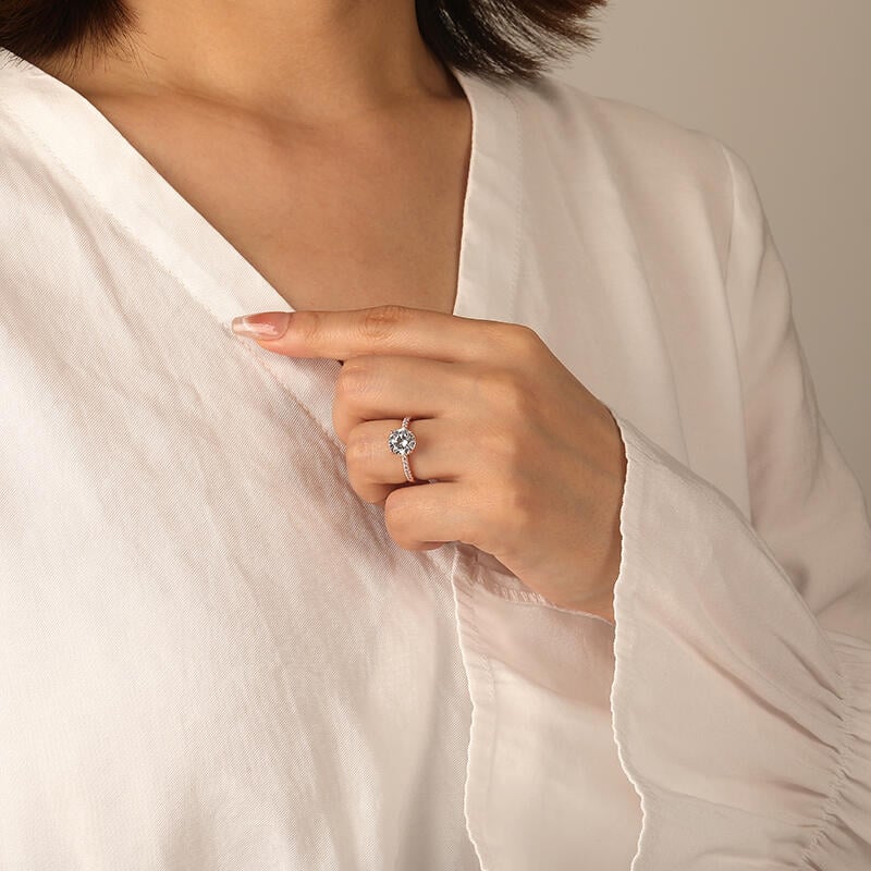 Classical and timeless. This engagement ring adorns a sparkling round cut stone that shines at the center, accompanied by the additional gleaming stones that reach from each side, making a forever announcement of true love. An ideal wedding surprise for her from SHE·SAID·YES, bring you a fortune marriage.