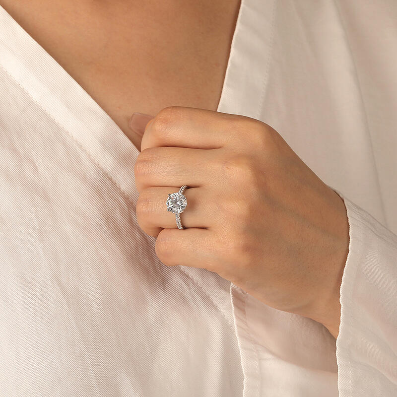 Classical and timeless. This engagement ring adorns a sparkling round cut stone that shines at the center, accompanied by the additional gleaming stones that reach from each side, making a forever announcement of true love. An ideal wedding surprise for her from SHE·SAID·YES, bring you a fortune marriage.