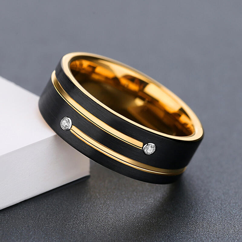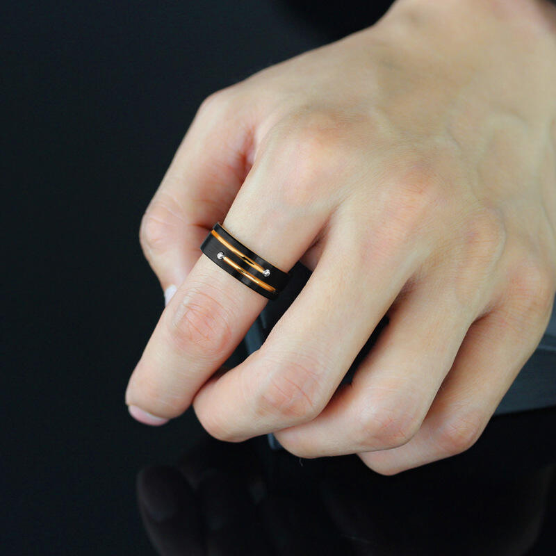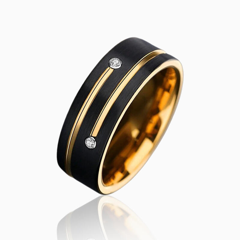 Crafted from durable tungsten carbide, this ring offers a substantial feel and lasting beauty. The contrast between black tungsten and golden elements symbolizes the balance of strength and elegance in a lasting partnership. Hypoallergenic and resistant to daily wear, this unique band stands as a fitting tribute to enduring love and commitment.