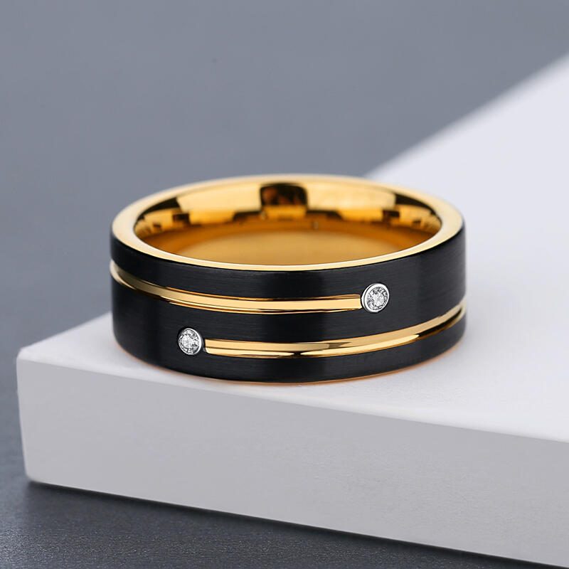This striking men's wedding band showcases an eye-catching asymmetrical design. Two round gems adorn the black tungsten carbide surface, each trailed by an elegant golden groove. A brushed finish adds subtle texture to the exterior, while a gold inner band provides a luxurious touch.