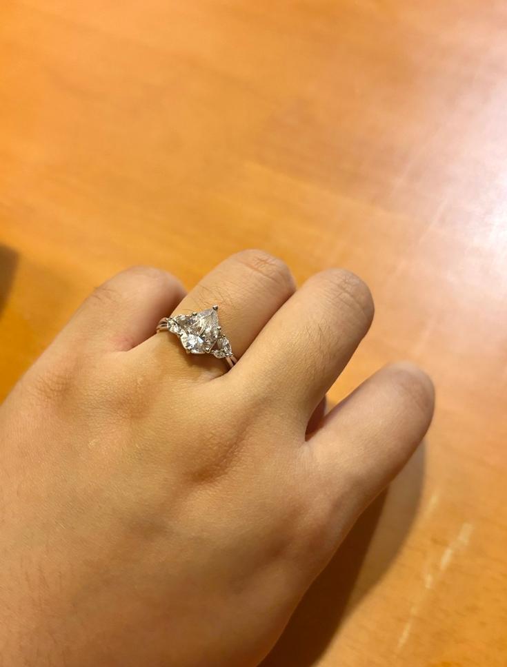 Lend you a touch of retro style with this dainty engagement ring. It features a sparkling Pear-cut center stone and a sleek shank intertwined with several marquise-cut buds towards the center for a natural vibe. Shining brightly on your big day, this ring is your dream one.