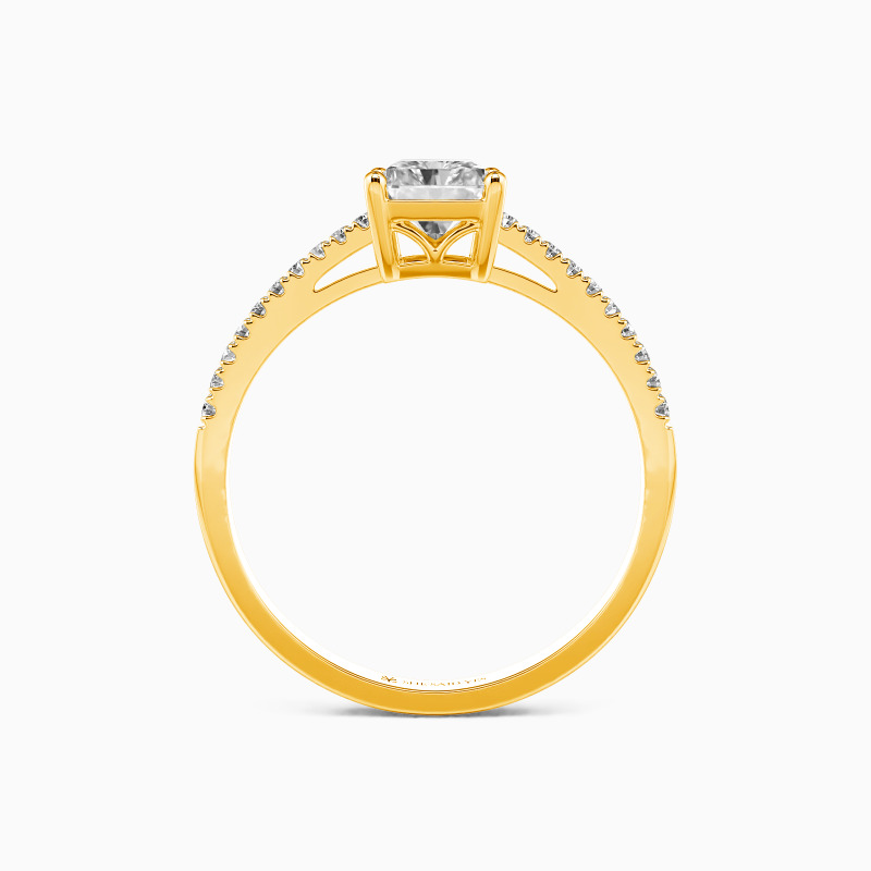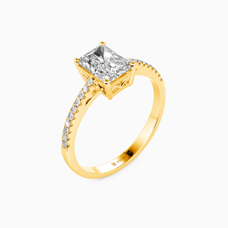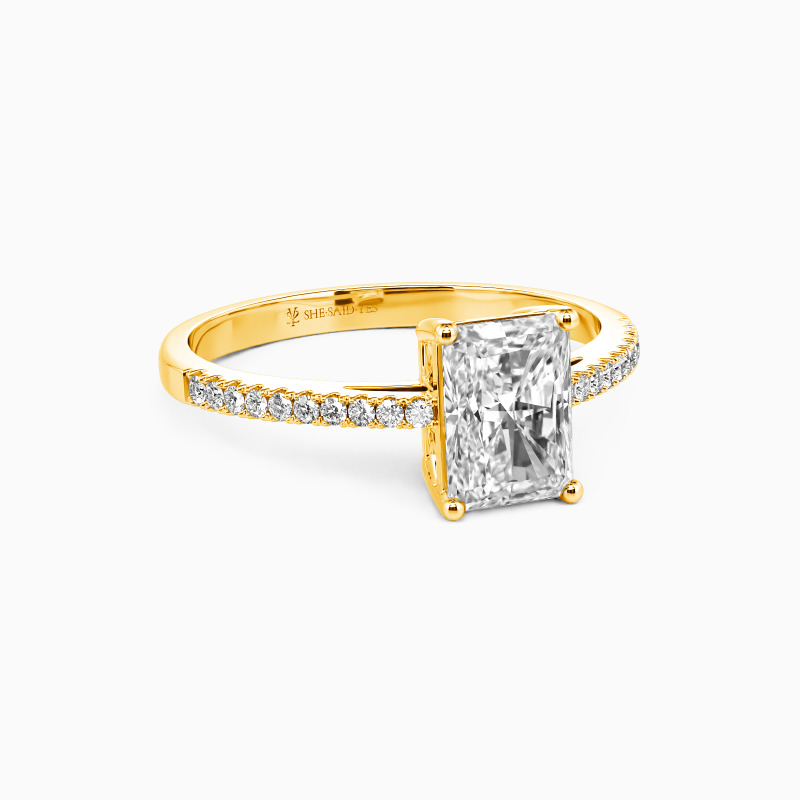 Elegant and elaborate. As the idealist type to enhance her incredible charm, this side stone ring is the best option to accentuate the dazzling glamour of the radiant-cut center stone. Adorned with the shimmering gems pave shank, this ring will make a striking impression on your perfect wedding.