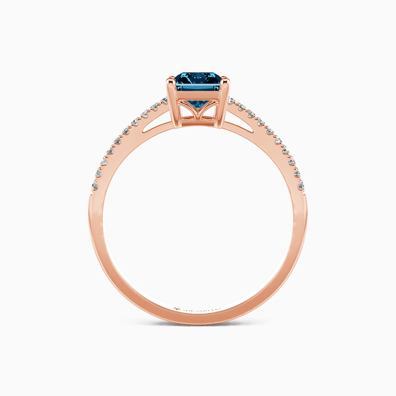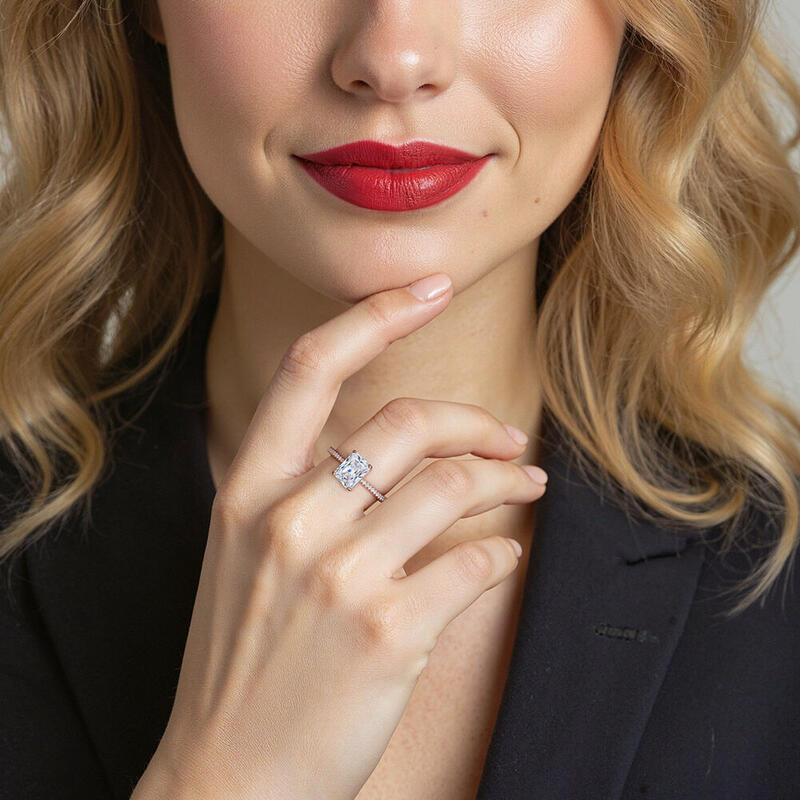 Elegant and elaborate. As the idealist type to enhance her incredible charm, this side stone ring is the best option to accentuate the dazzling glamour of the radiant-cut center stone. Adorned with the shimmering gems pave shank, this ring will make a striking impression on your perfect wedding.