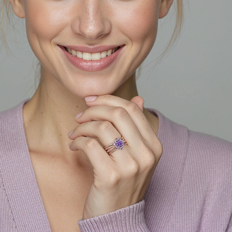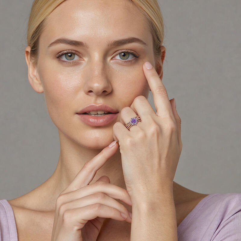 Handcrafted in the elegant design, this cherished bridal set embedded a round-cut center gem enveloped by a glistening halo of diverse small stones as a graceful snowflake on a polished shank. Coordinating with an interchangeable twisted band accented with shining round stones adds a touch of refined beauty to women.