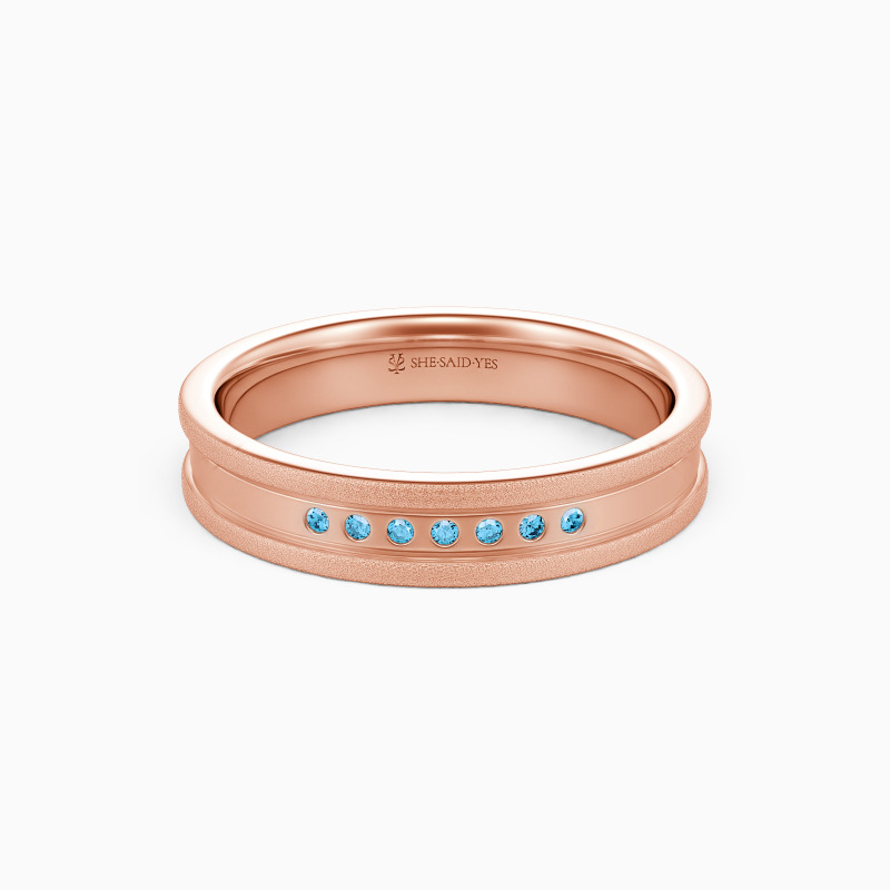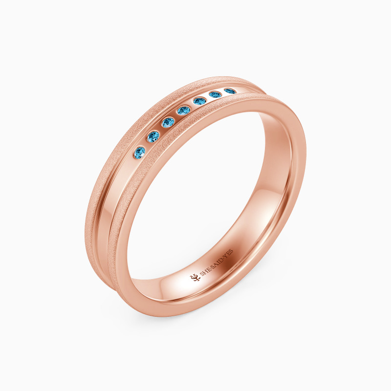 With a striking wedding band to achieve her sweet dream. Paved with seven round-cut shimmering stones neatly along the center of the polished finish and the double matte strips around the band, a sense of refined sparkle is brought to this wedding ring, expressing the gentle and soft love for your beloved one.