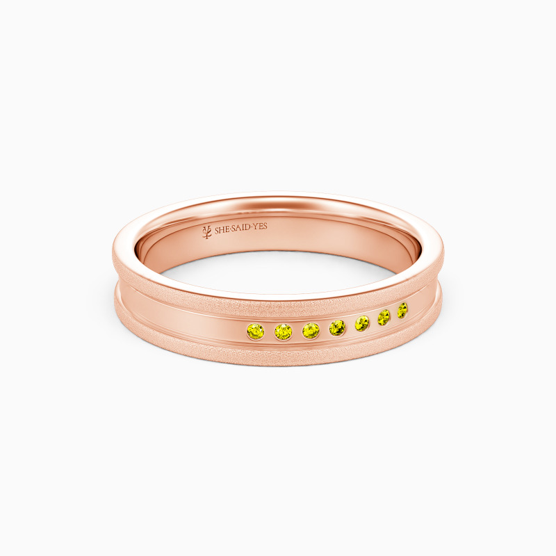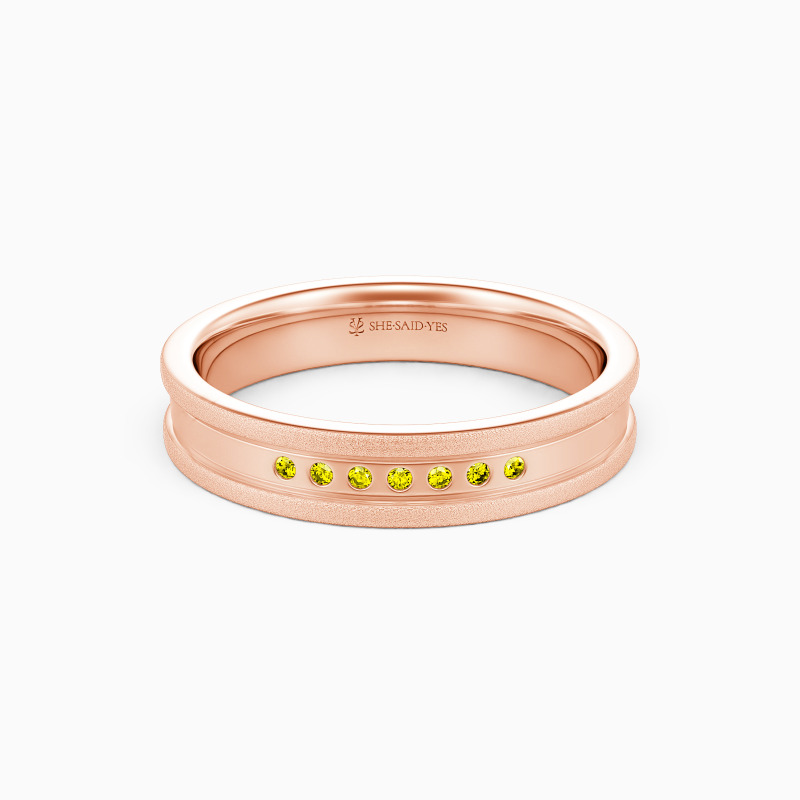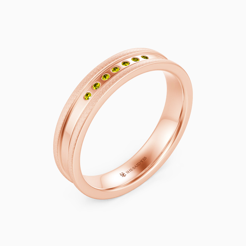 With a striking wedding band to achieve her sweet dream. Paved with seven round-cut shimmering stones neatly along the center of the polished finish and the double matte strips around the band, a sense of refined sparkle is brought to this wedding ring, expressing the gentle and soft love for your beloved one.