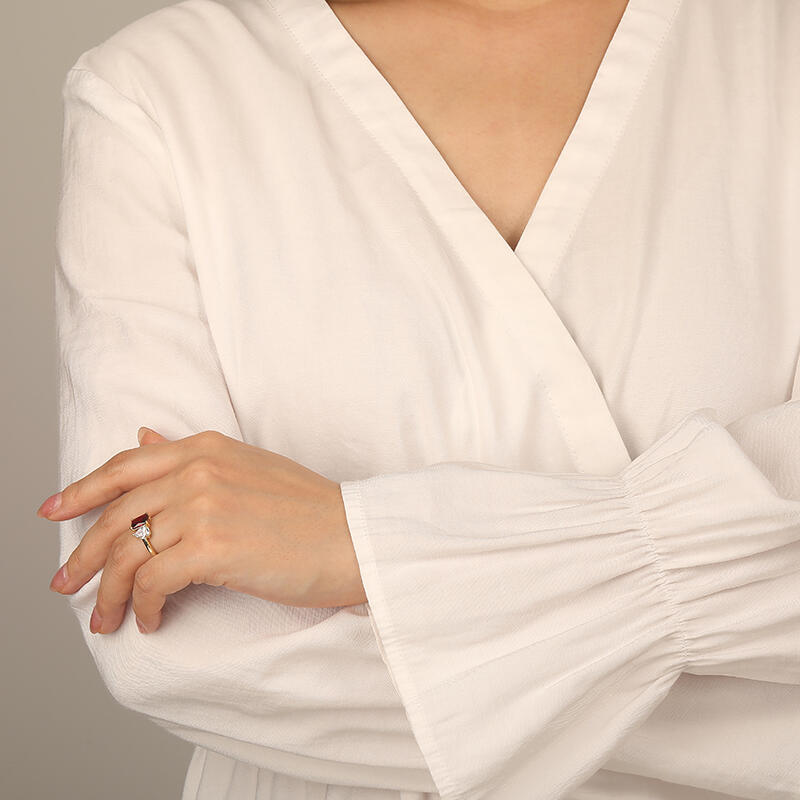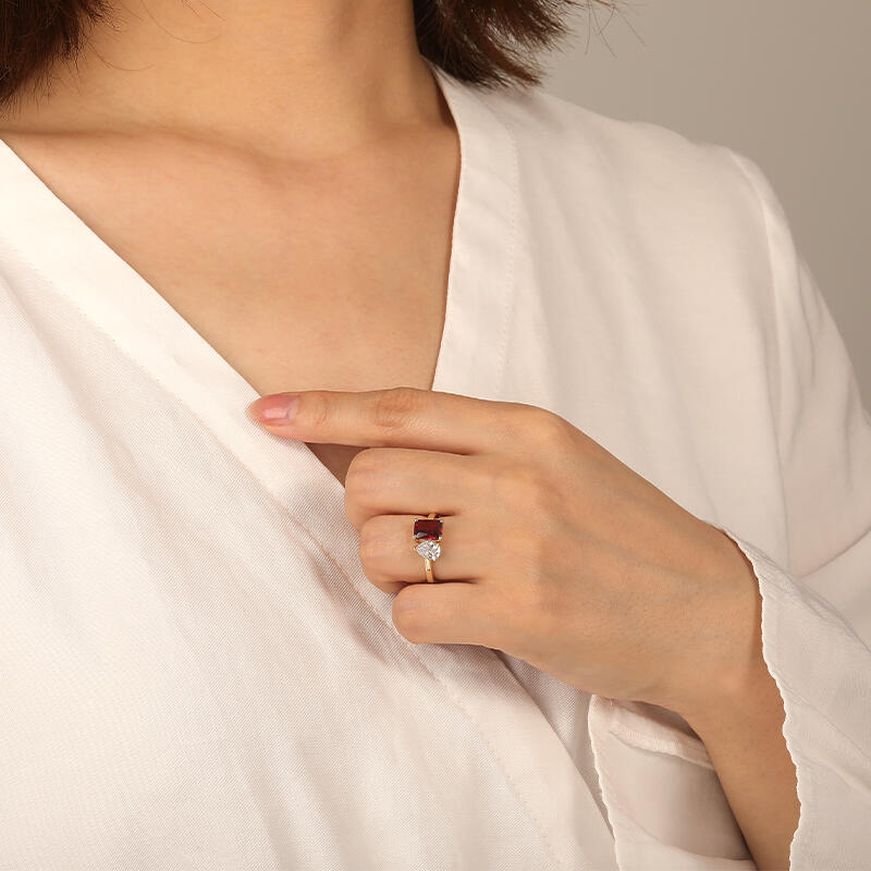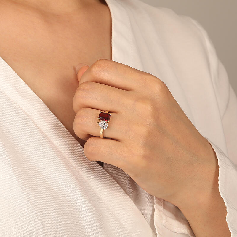 This elegant engagement ring presents a striking radiant-cut gemstone alongside a shapely pear-cut stone. Their faceted forms showcase each gem's natural brilliance in distinct yet complementary fashions. Crafted in a balanced design, this ring beautifully symbolizes the unique connection between two loved ones with its timeless blend of shapes and sparkling gems.