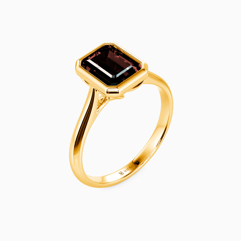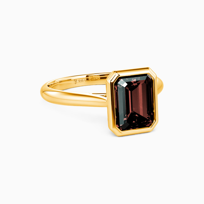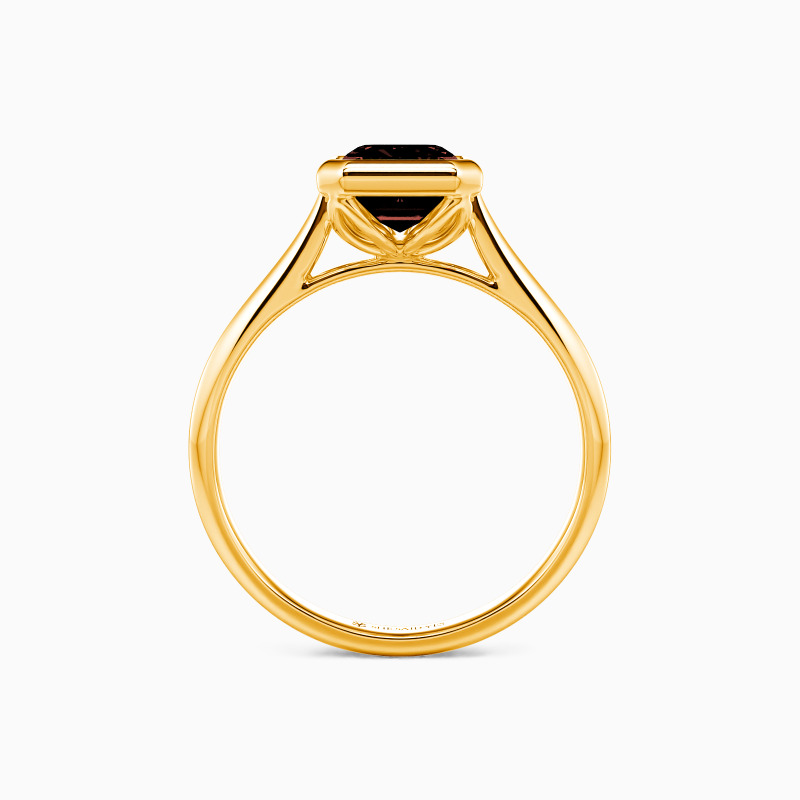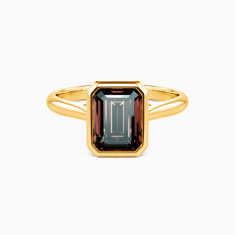 Epitomizing minimalist elegance, this solitaire engagement ring features an emerald-cut center stone, bezel-set to accentuate its geometric beauty. The clean lines of the setting allow the gem to take center stage, radiating with unmatched brilliance. The tapered shank, subtly refining the design, complements the stone perfectly. This ring is a testament to the power of simplicity, ideal for those who find beauty in understated sophistication.