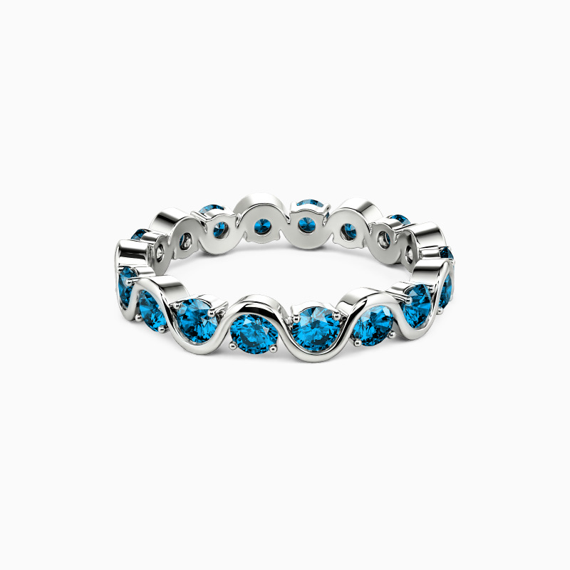 A swirl band design takes this eternity wedding band to the next level. Several glittering pronged accents are encrusted on the unique dimensional band with a continuous swirl design. Stack it with your engagement ring or wear solo permits to its modern aesthetic finish. Let this eternity wedding band join in your beautiful life.