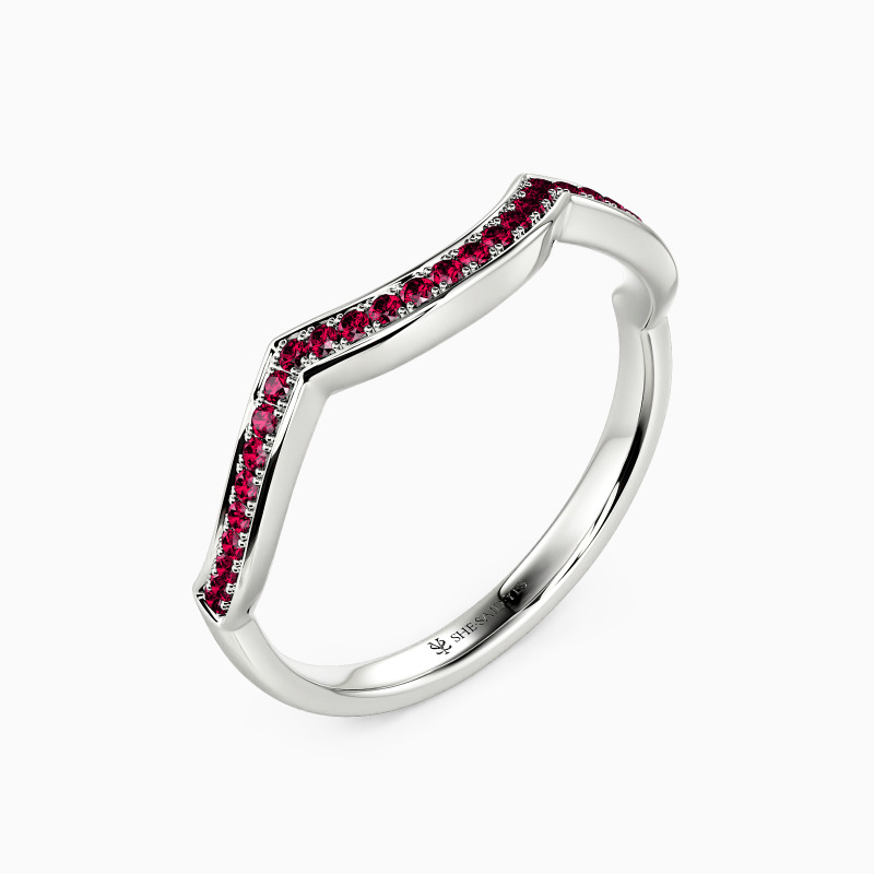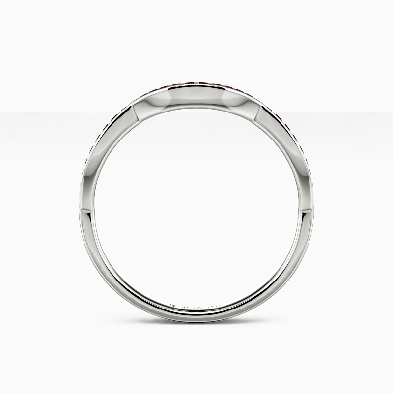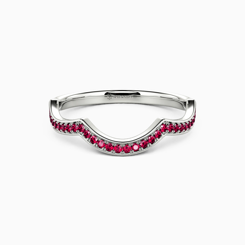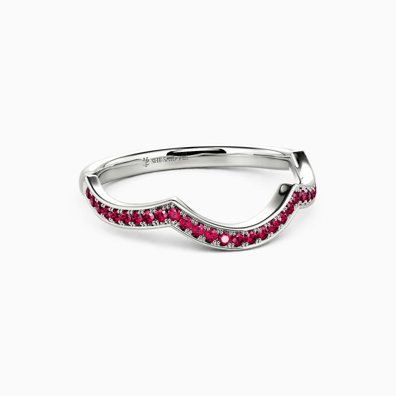 An elegantly curved wedding band featuring a series of sparkling gemstones set in a neat channel setting, this dreamy ring is the perfect companion for any style.