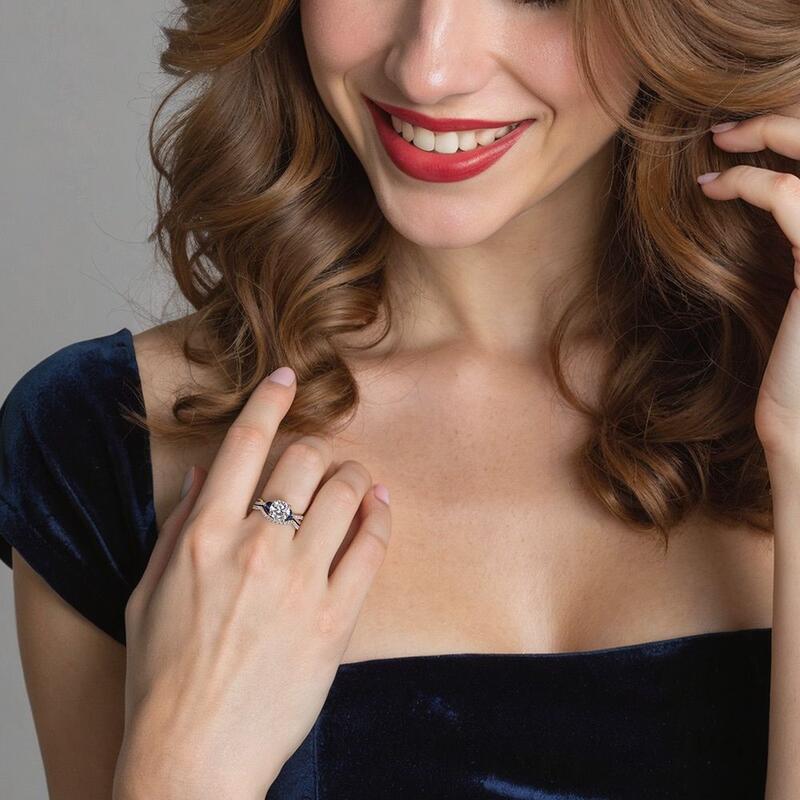 This exquisite bridal set is a true symbol of everlasting love and elegance. A round-cut center stone sparkles above high, complemented by a hidden halo for an added touch of brilliance. Four marquise side stones gracefully enhance the beauty of the centerpiece. The cross-over design of the shank adds a unique flair, with one half adorned with dazzling gems while the other half remains elegantly plain. Completing this enchanting set is a matching curved wedding band meticulously paved with sparkling gems, creating a seamless and captivating ensemble.