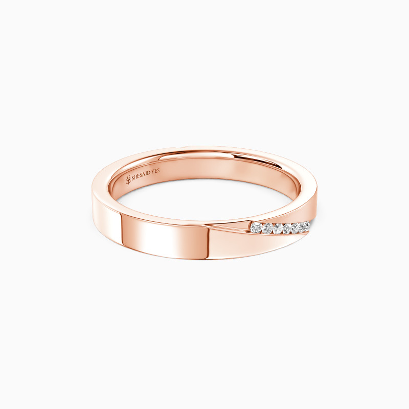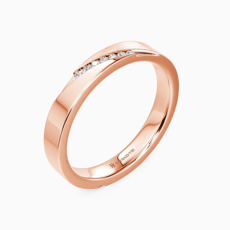 This wedding band artfully blends high-polish shine with brushed texture, catching light and shadow in equal measure. Tiny gems scatter like constellations along its surface—understated yet luminous. The duality speaks to modern femininity: refined yet bold, delicate but enduring. A ring that feels both effortless and unforgettable.