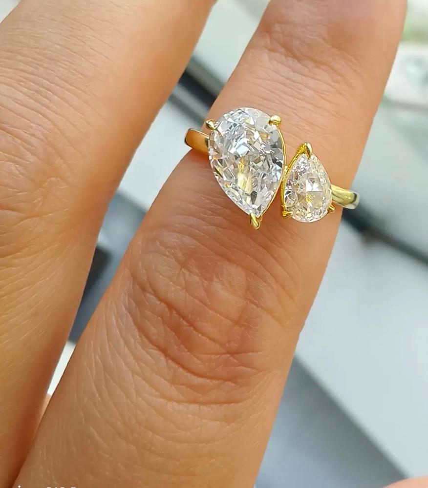 A modern twist on romance, this toi et moi ring features two elegant pear-cut gemstones in complementary sizes, symbolizing two souls united. Set on a sleek, polished band for contrast, the asymmetrical design blends contemporary artistry with timeless meaning—perfect for couples who celebrate individuality while embracing their unique bond. A love story told in gemstones.