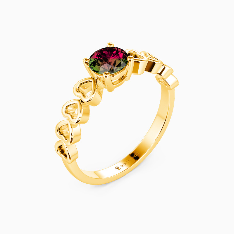 Whimsical in design, this engagement ring is a high representation of the fanciful style. Crafted in polished metal, this band carves a whole row of heart frames arching toward the round-cut center stone. Highlighting the radiance of the center stone with boldness, this wedding ring will catch your sight at first glance.