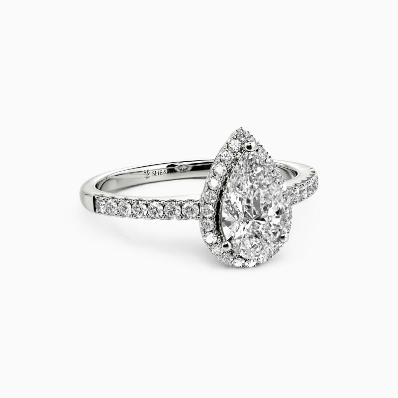This twinkling engagement ring is the final expression of timeless love. With a shimmering pear-cut stone set in the middle wrapped by a glistening halo of round stones, the ring flawlessly presents a dazzling sparkle and attractive charm on the paved shank. Said yes to your true love with this timeless treasure and began your future story.