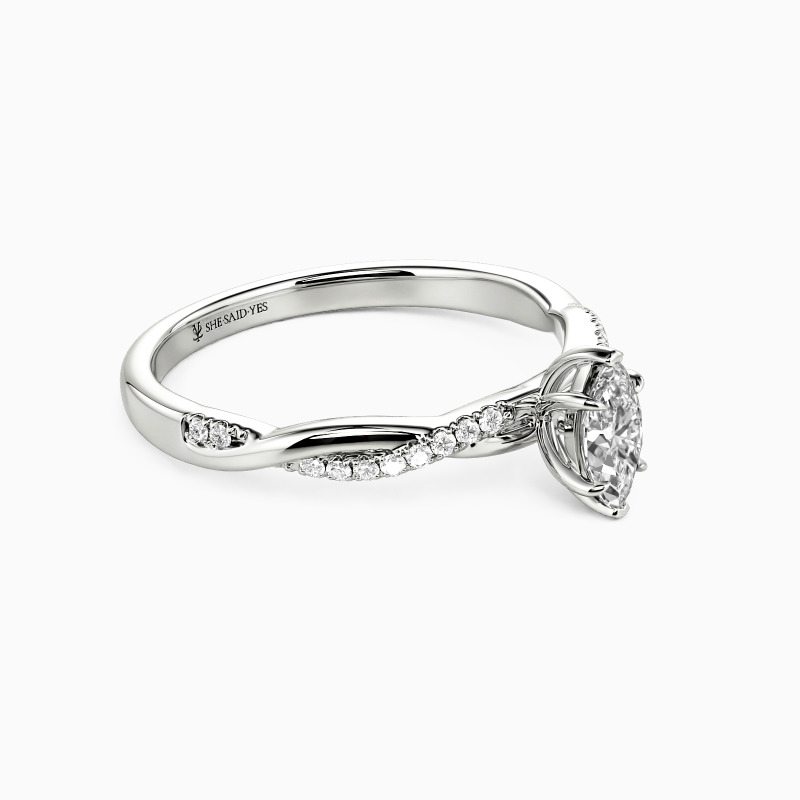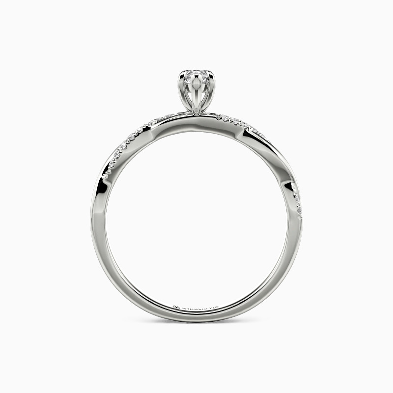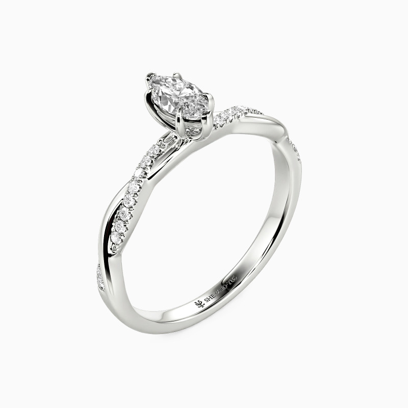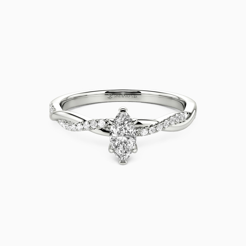 A dazzling marquise-cut center stone is nestled within six claws, standing perfectly on the intertwined shank. A row of sparkling accent stones is paved on one ribbon, adding extra sparkle and chic to the entire ring.