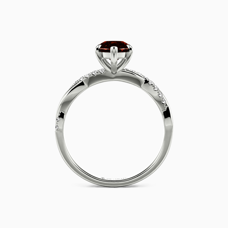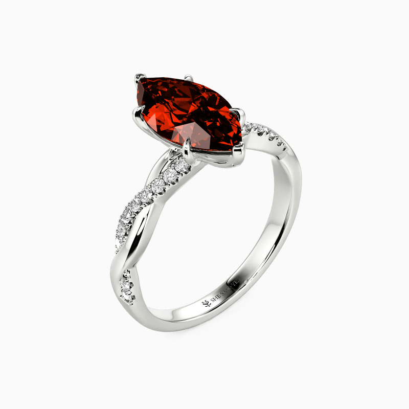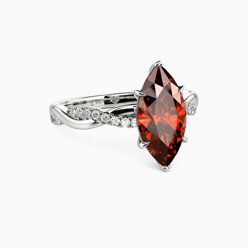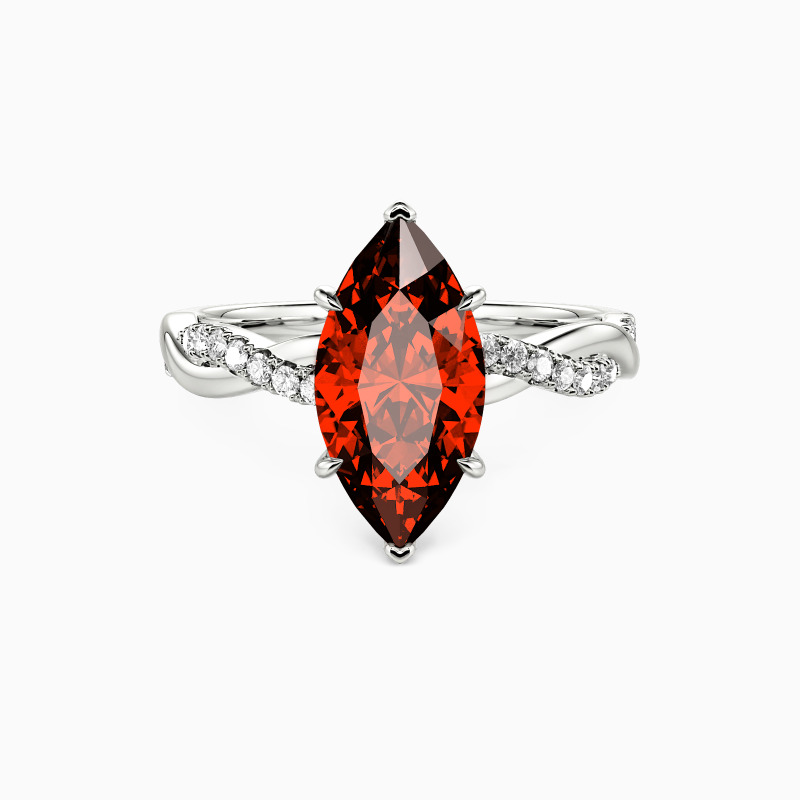 A dazzling marquise-cut center stone is nestled within six claws, standing perfectly on the intertwined shank. A row of sparkling accent stones is paved on one ribbon, adding extra sparkle and chic to the entire ring.