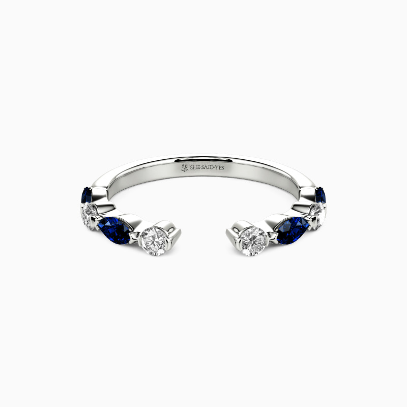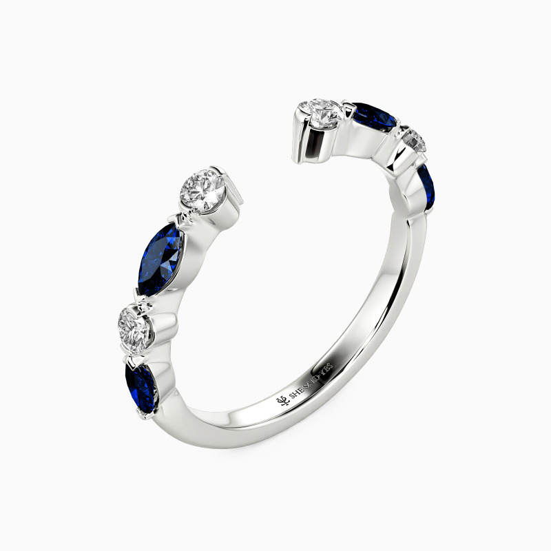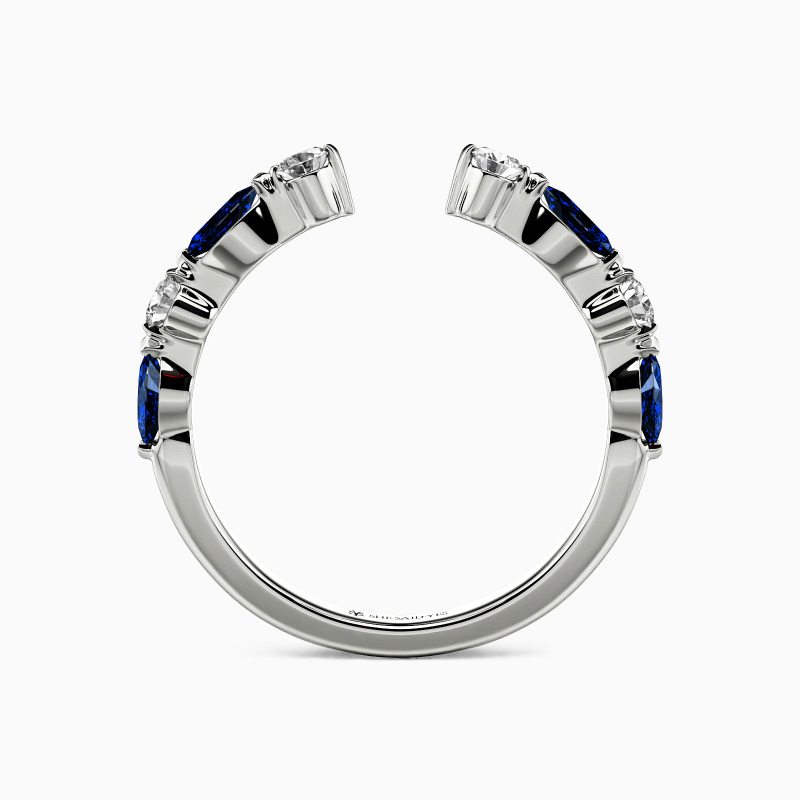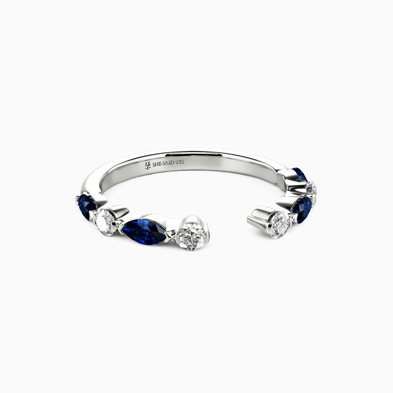 Graceful and versatile, this open wedding band features alternating round and marquise gems adorning one half. Its elegant design allows it to be worn alone for a sophisticated look or stacked with other rings for a personalized touch. A symbol of eternal love and style, this band effortlessly captures the essence of romance.