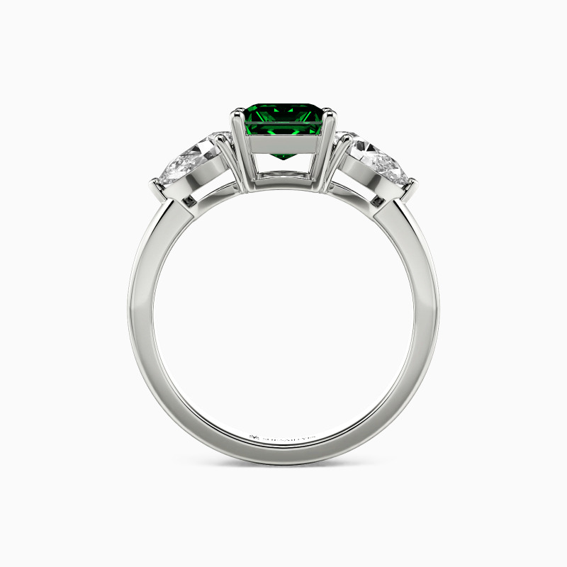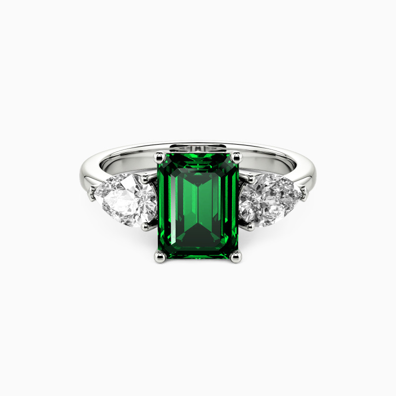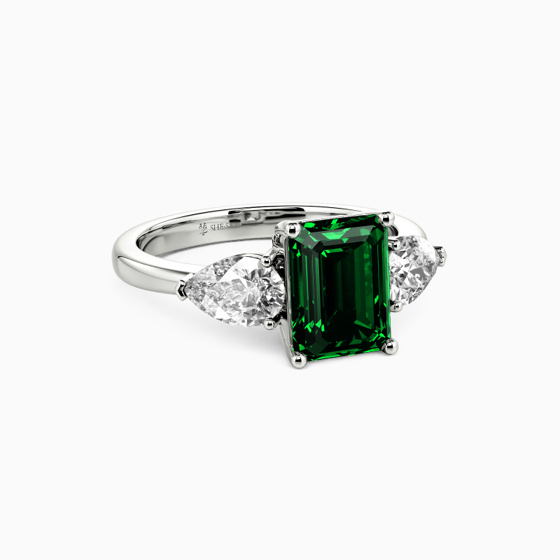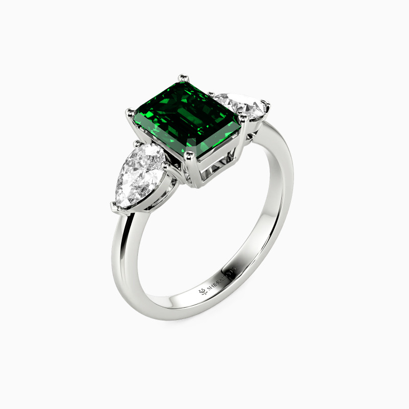 This three-stone engagement ring is a testament to elegance and sophistication. It features an emerald-cut center stone flanked by two pear-cut stones. The teardrop shapes add a touch of softness and romance to the overall arrangement. This piece is a captivating symbol of love's past, present, and future, weaving a tale as radiant and enduring as the stones themselves.
