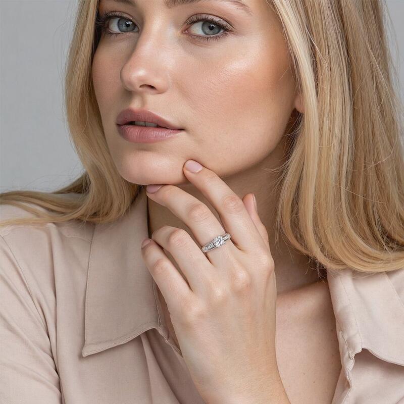 Sophisticated and well-crafted. The charm of this fantastic engagement ring is laid on its magnificently shining side stones. With a stunning radiant-cut gemstone set in the center, a sparkling channel setting on the shank flashes gorgeously. And countless round stones paved on the profile further enhance the entire gloss.