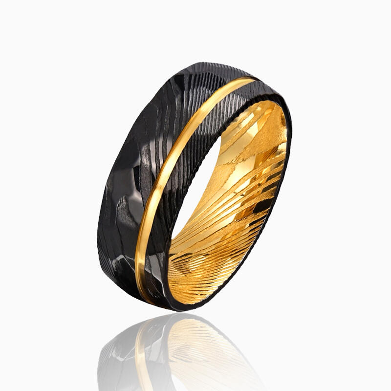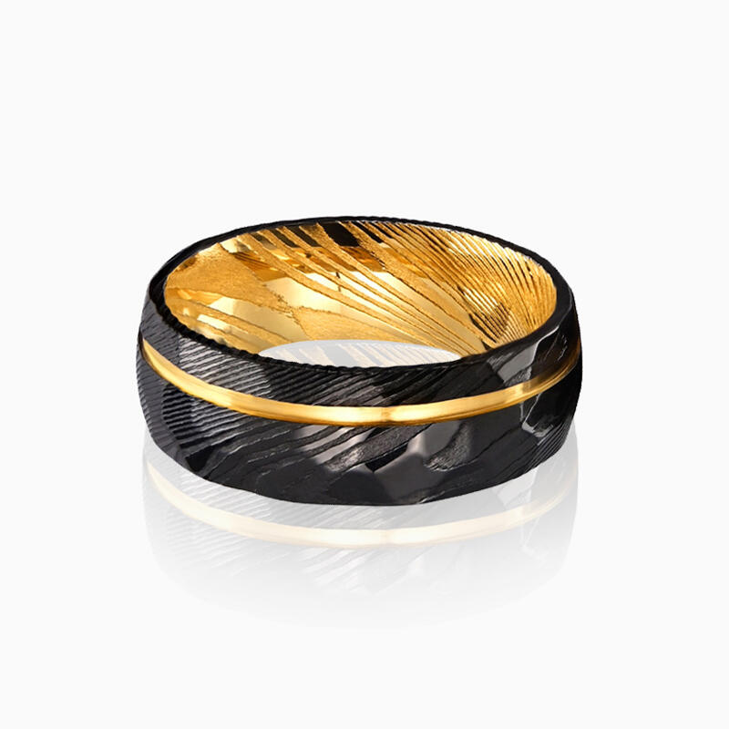 This striking men's wedding band features a meticulously hammered Damascus steel exterior, creating a rugged yet sophisticated texture. A sleek gold channel runs along the ring, adding a refined touch of luxury and creating a captivating contrast with the black. The band's interior showcases a full gold-colored finish, offering a warm and unexpected element that complements the exterior design.