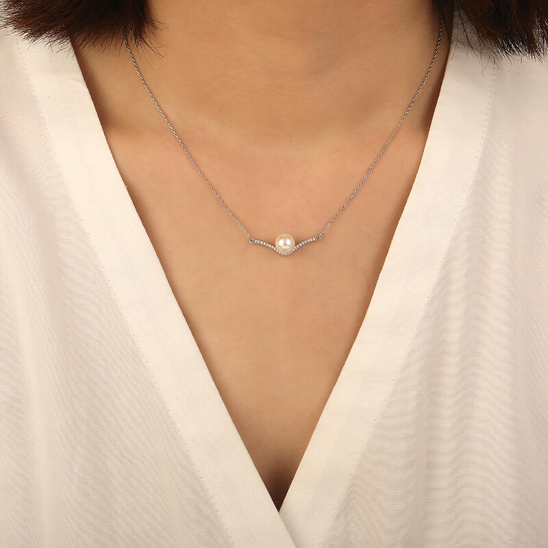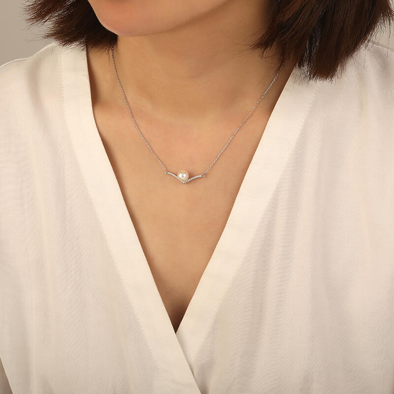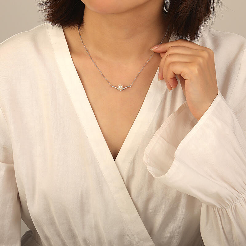 Elegant and radiant, this pearl necklace is a showcase of exquisite craftsmanship. Adorned with gleaming gems, it culminates in a central pearl, the epitome of grace and sophistication. The necklace's bold geometry harmoniously contrasts with the pearl's delicate luster, striking a perfect balance between modern flair and timeless beauty. A truly eye-catching piece, it effortlessly adds a touch of luxury and refinement to any ensemble.